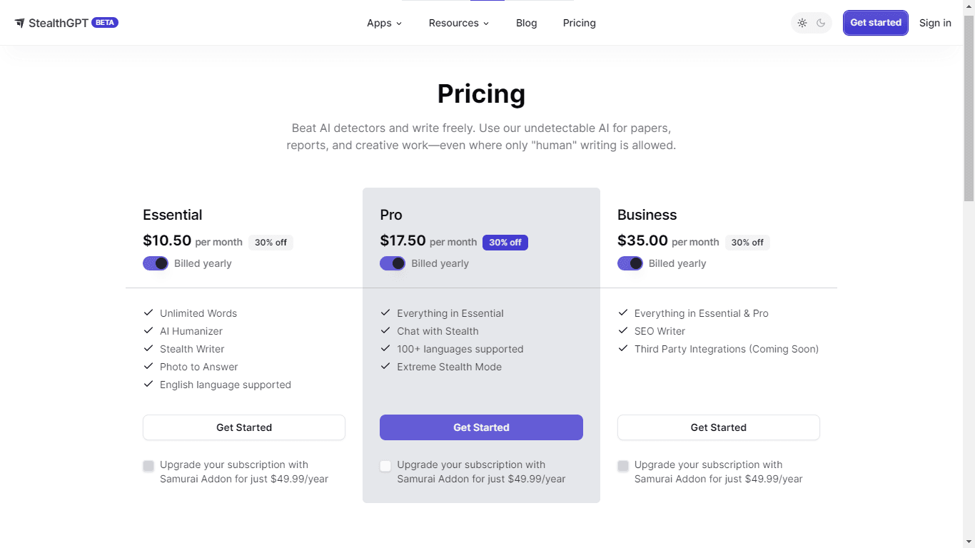 When you subscribe to StealthGPT, you get your money's worth and more. Here's a screenshot of StealthGPT's pricing plans: