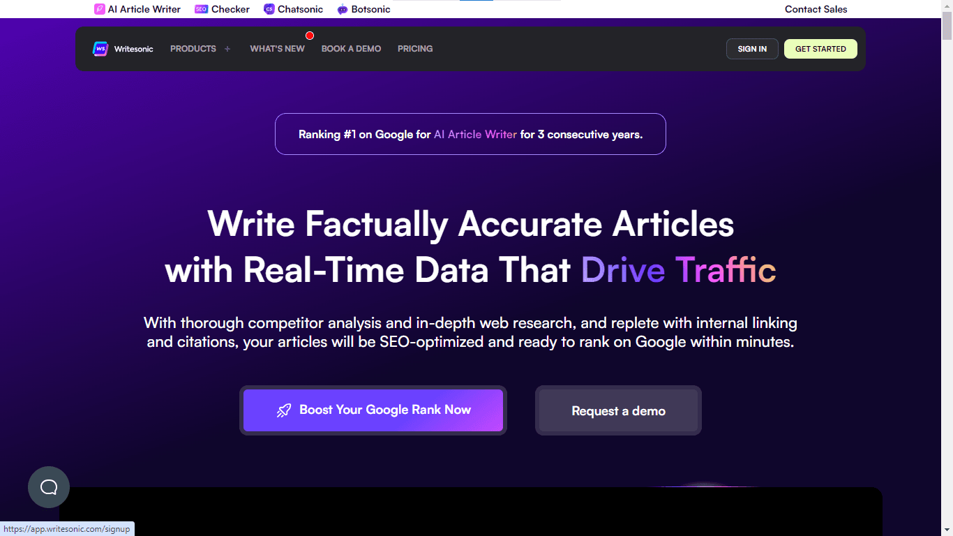 For three years, Writesonic was the number 1 AI article writer on Google. Writesonic’s Article Writer 6.0 generates blog posts ranging from 500 to 5,000 words. This high word count limit hastens the pace at which you can write articles using the tool.