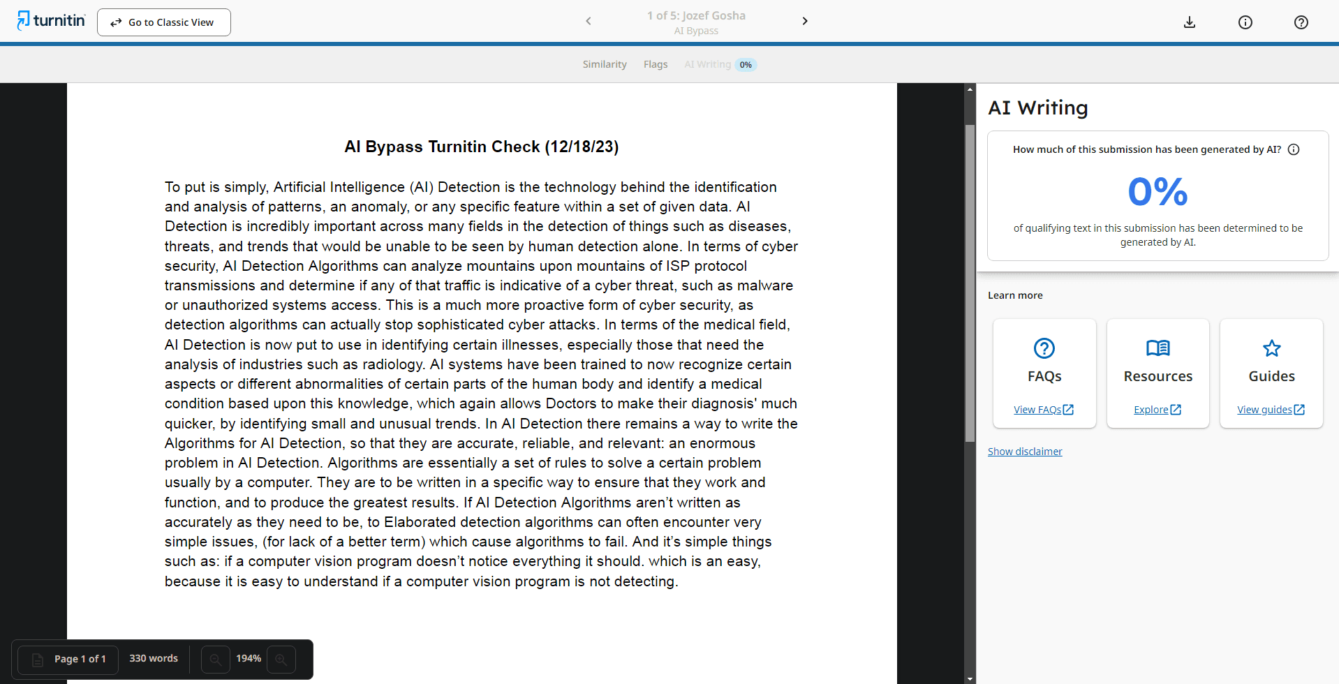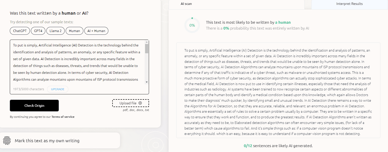 Wow, AI Bypass scores an impressive 0% probability that the text was written by AI. That's as good as you're going to get. If you submit this text in any setting its very unlikely to be picked up. Also GPTZero denotates that 0 of the 23 of the sentences in the text are likely to be AI generated. This is a fantastic result, but it is only one AI detector, let's continue our experiment.