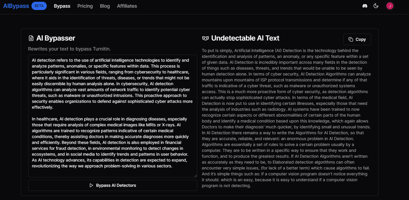 So what is AI Bypass: It is a one trick pony, a bypasser where you can bring your AI Generated content and have it humanized/rephrased to bypass leading AI Detectors including but not limited to: GPTZero, Originality, CopyLeaks and most importantly, Turnitin.