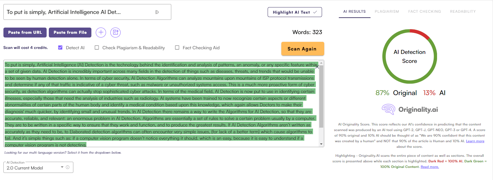 Originality.ai is a lesser known AI detector but it is still one of the big three in our opinion. It has been historically one of the more accurate detectors we've seen. Their latest 2.0 model has proved very difficult to bypass. We have another tough test for AI Bypass. Let's see what happens: