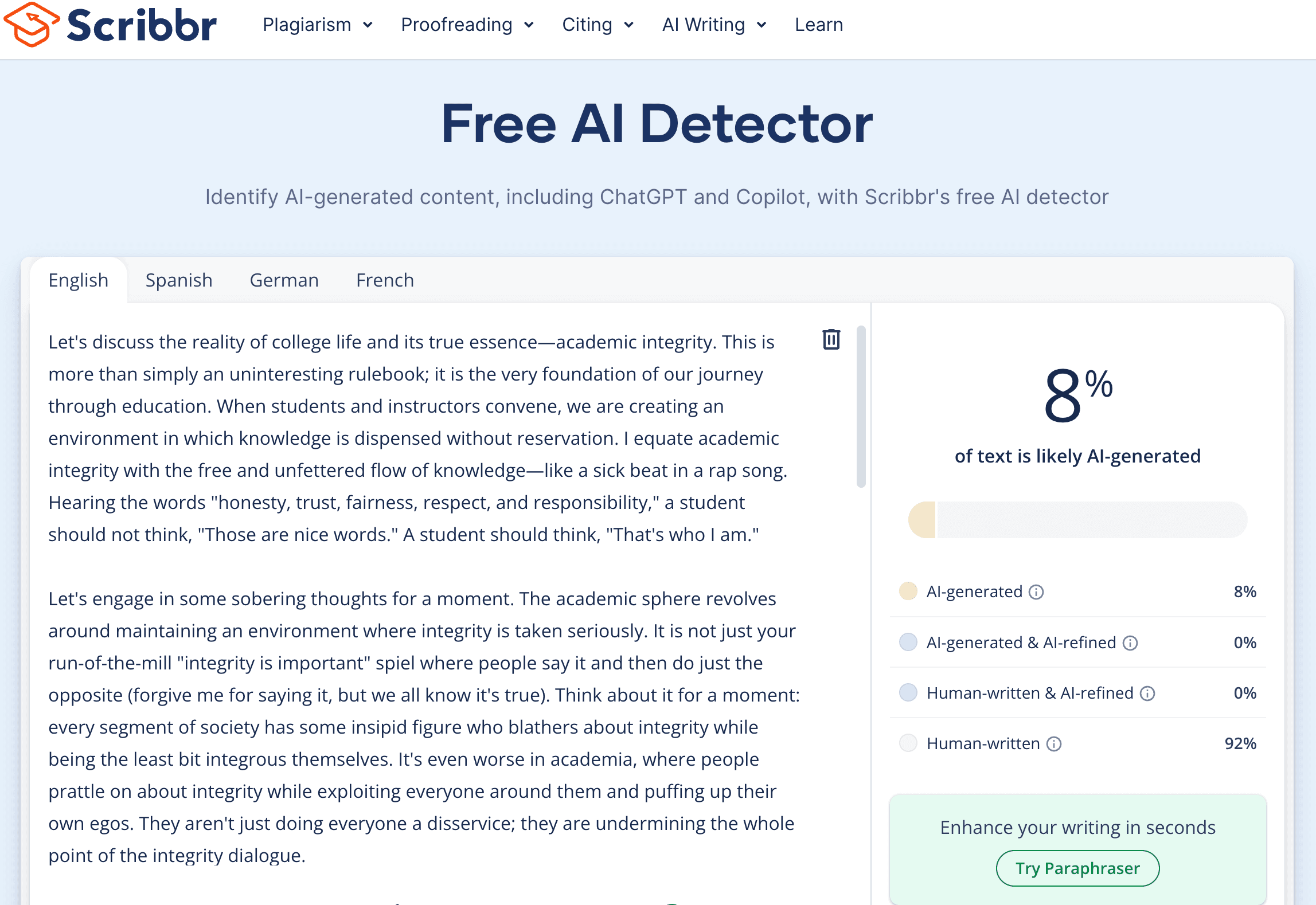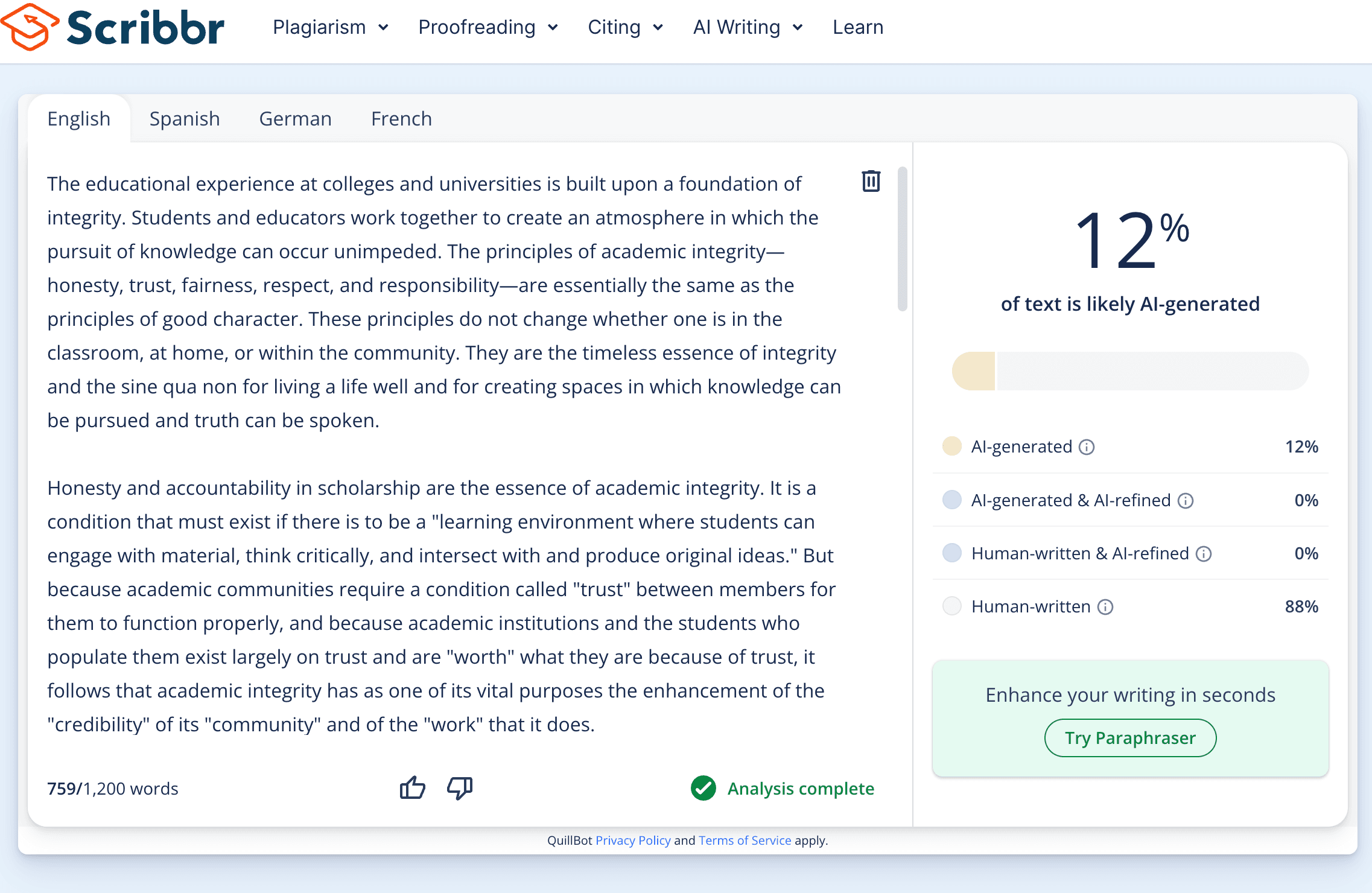 And here's what happens when we put Stealth Writer's essay through Scribbr: