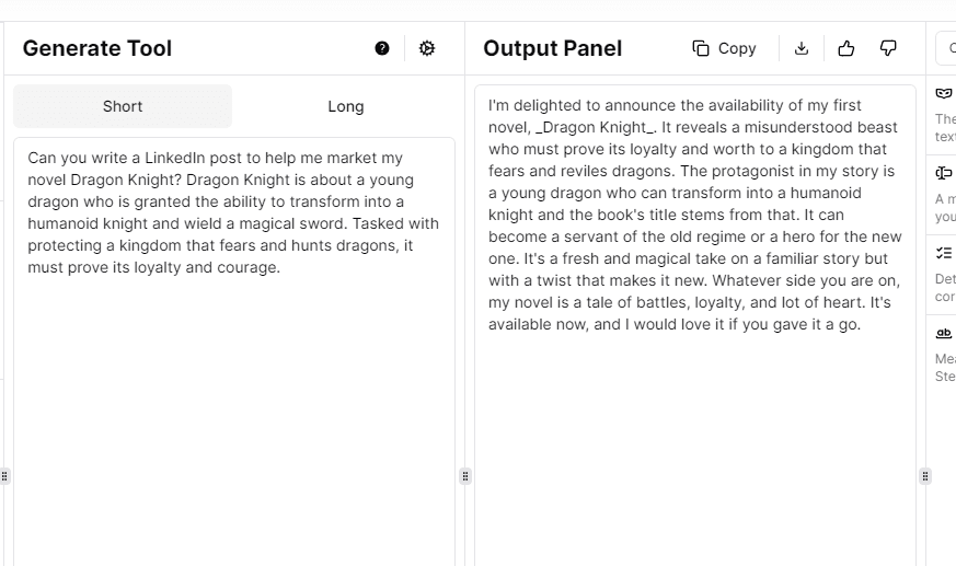 Here’s me asking Stealth Writer to give me a LinkedIn post for my fantasy novel: