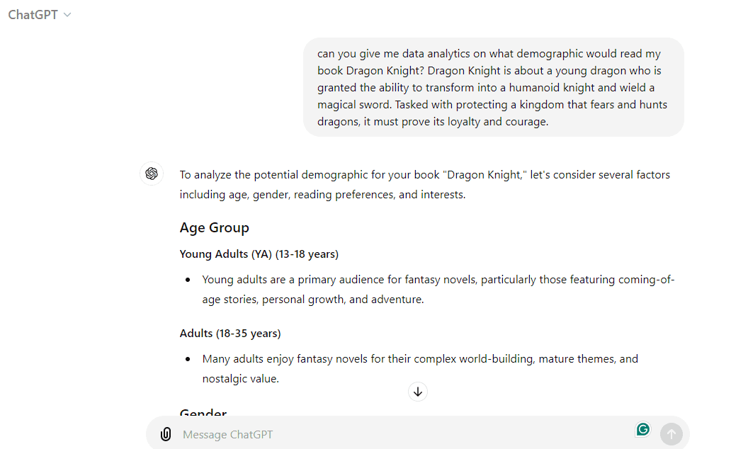 Here’s me asking ChatGPT for data analysis of what kinds of people would read my fantasy novel, Dragon Knight.