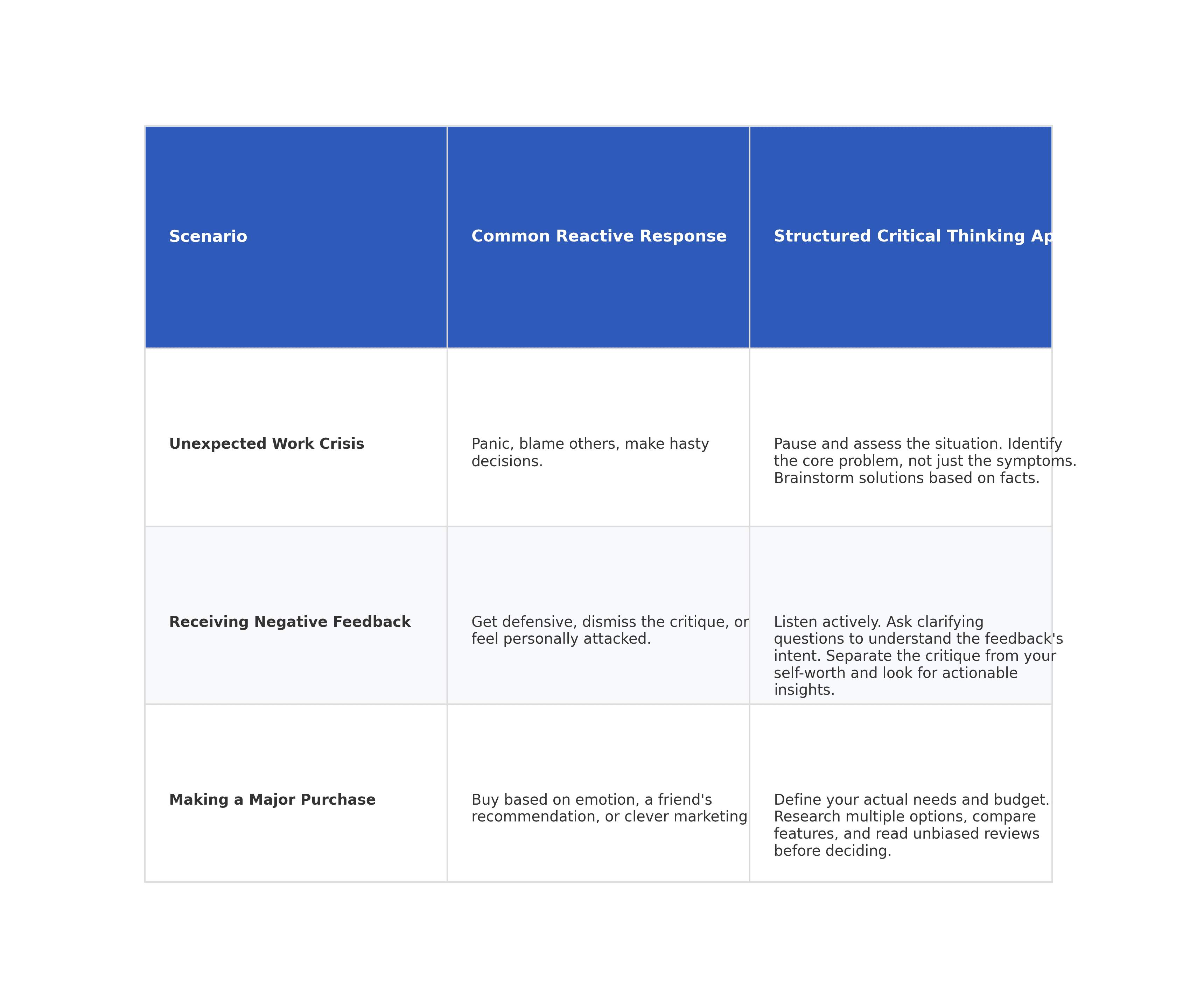 To make this even more practical, here’s a simple framework comparing reactive responses to critical thinking in a few common situations.