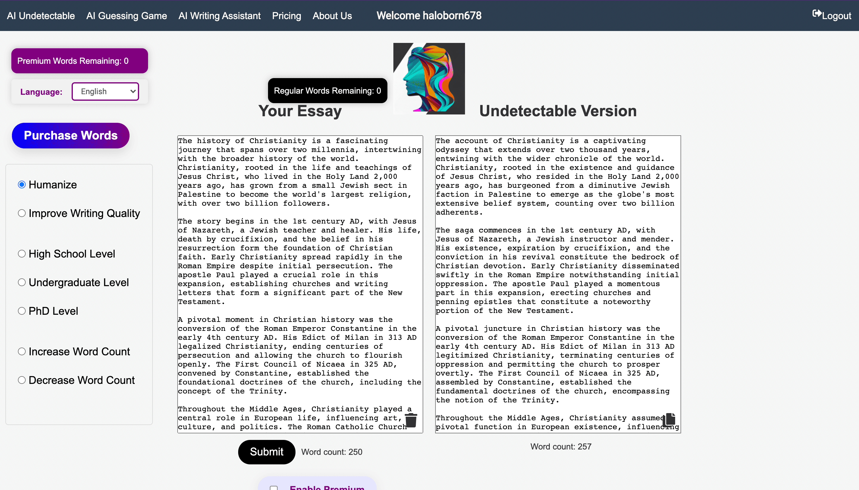 In AI Undetectable, “regular” words are cheaper than “premium” words. While AI Undetectable appears to advise users to select “premium” words, it doesn't say anything against choosing “regular words.”