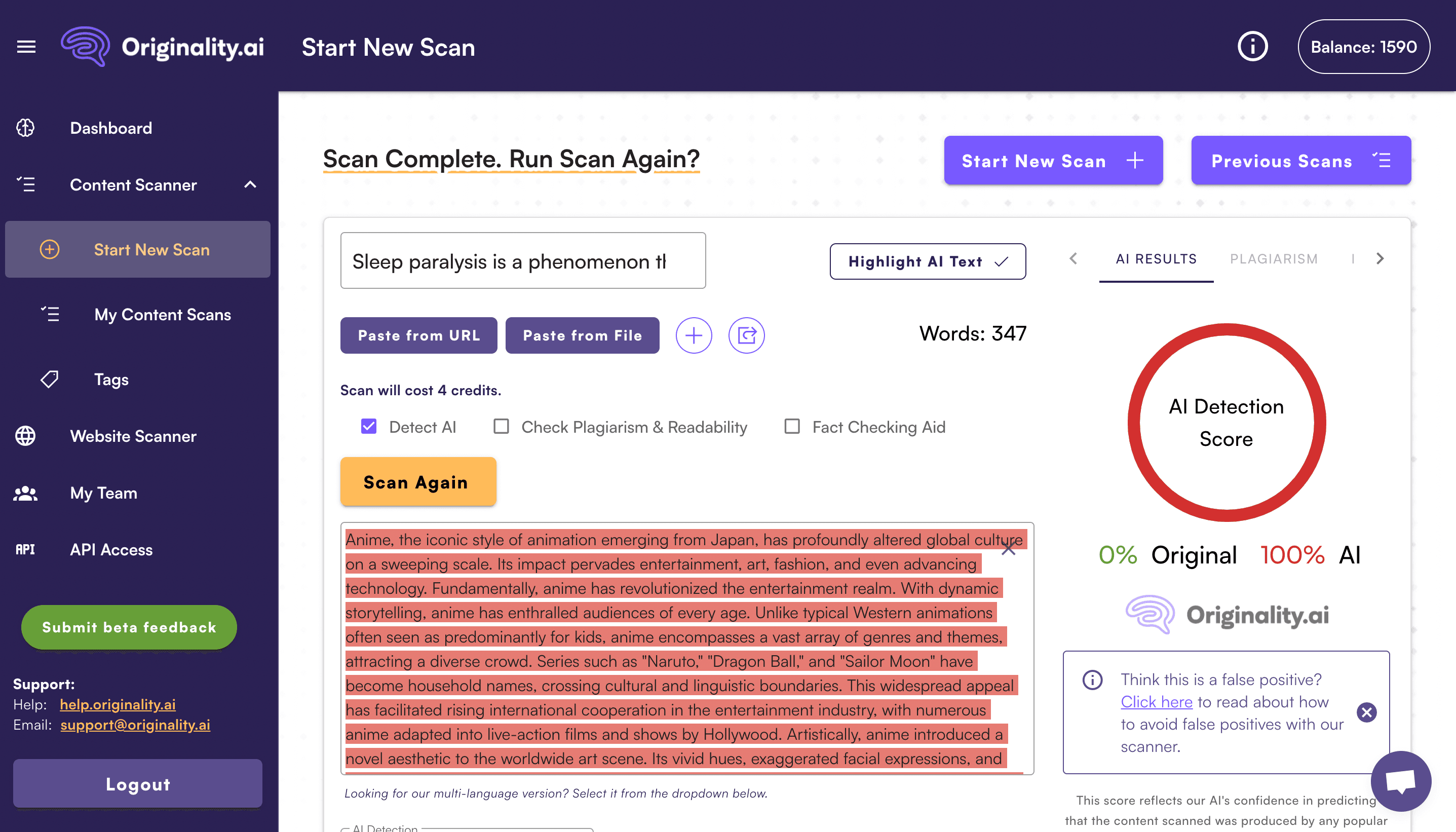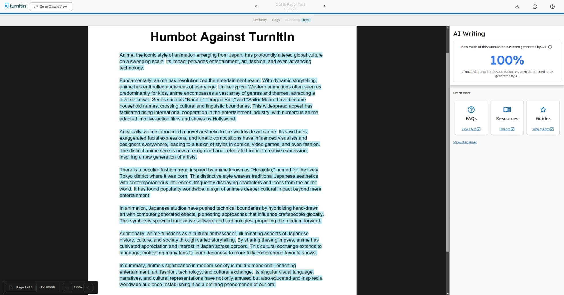 100% detection score from TurnItIn is the nail in the coffin that proves that Humbot cannot go up against major AI detectors such as GPTZero, Originality, and TurnItIn.