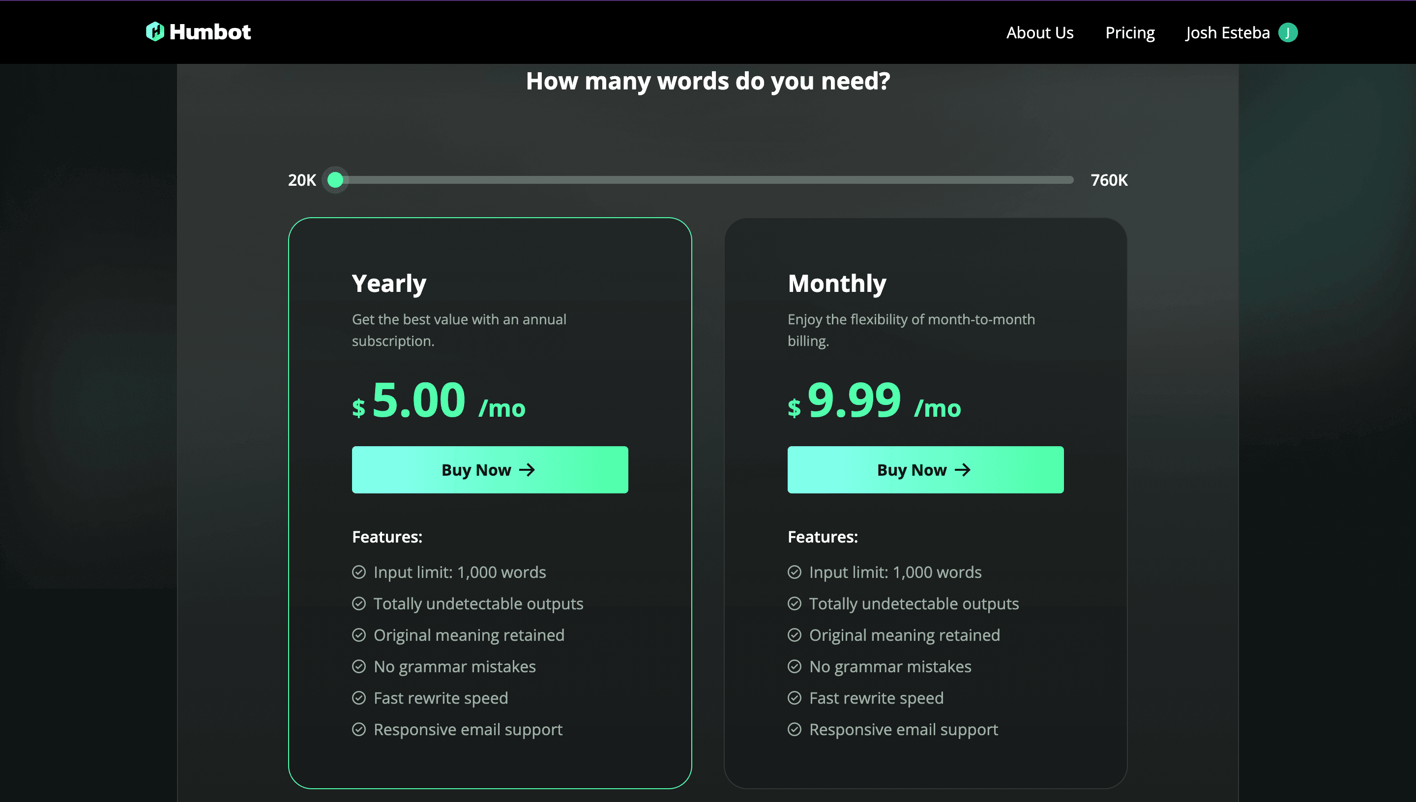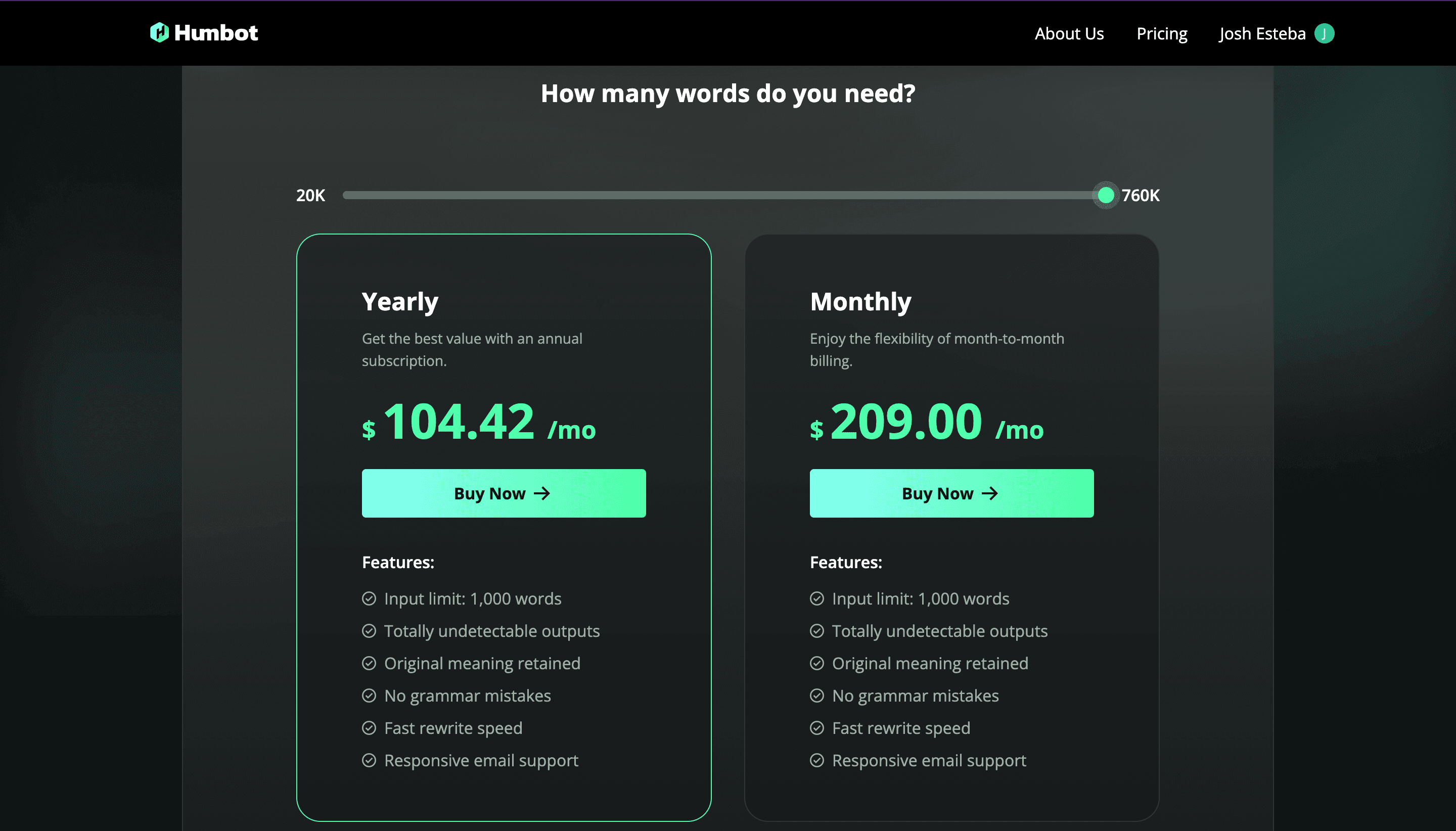 When we are looking at the pricing alone, Humbot does have a cheaper pricing option; however, Humbot only allows for 20,000 words per month. StealthGPT offers 80,000 more words per month while also being effective. Humbot does have a flexible plan option for users, making it an enticing option for highschool or college students, but there is an increase risk of getting caught by AI detectors. Would you pay as cheaply as you can in exchange for a higher chance of getting caught? The consequences aren't worth the hassle. In the end, StealthGPT's value and pricing beats Humbot without a doubt.