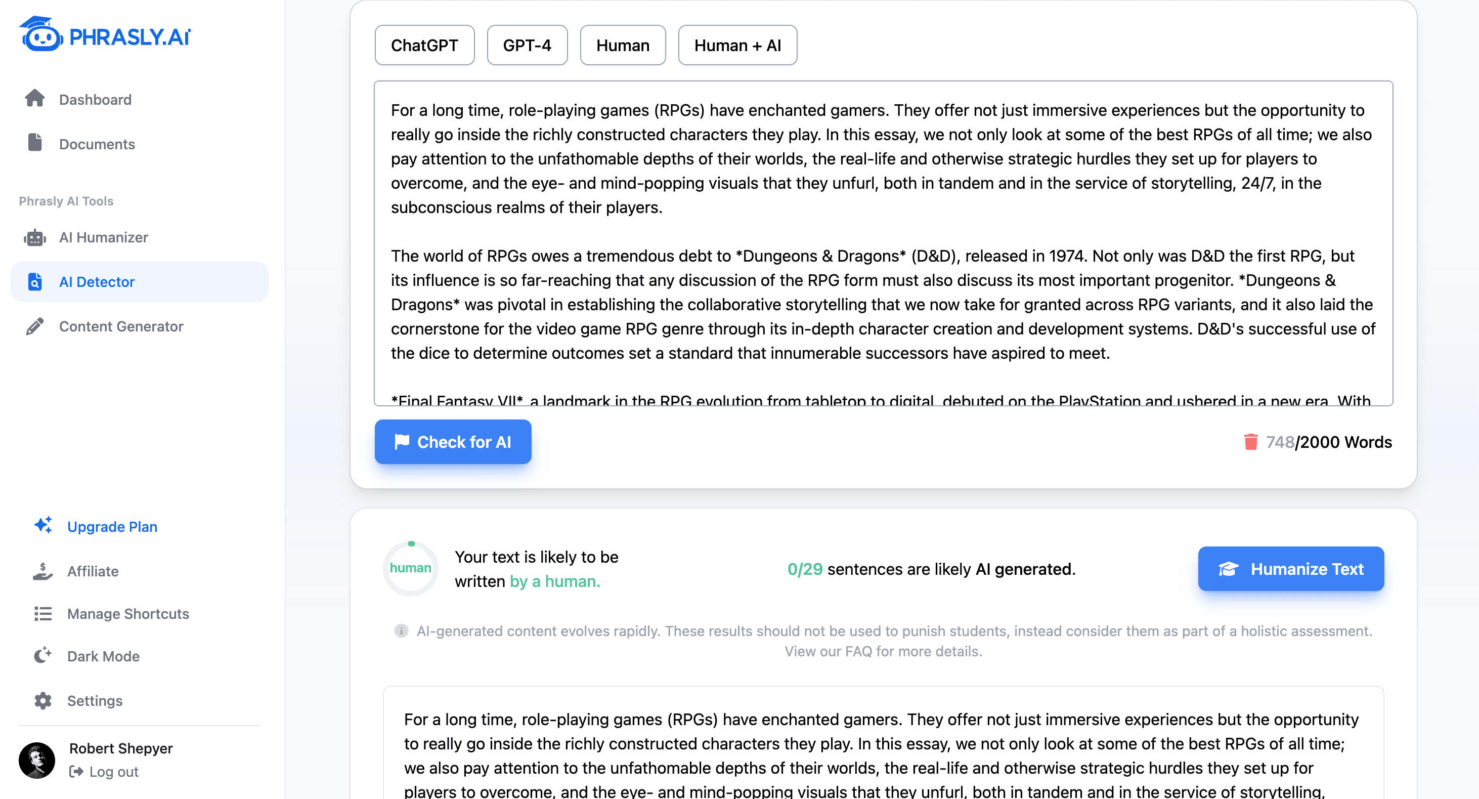 Now that we’ve covered the basics, onto the testing. Does Phrasly work? Well, in the most basic sense, it needs to be able to catch ChatGPT’s text in order to do so. Phrasly’s free AI detector has numerous options for your detection such as ChatGPT, GPT-4, Human and Human + AI. These options are slightly outdated because there’s already a new ChatGPT AI model.