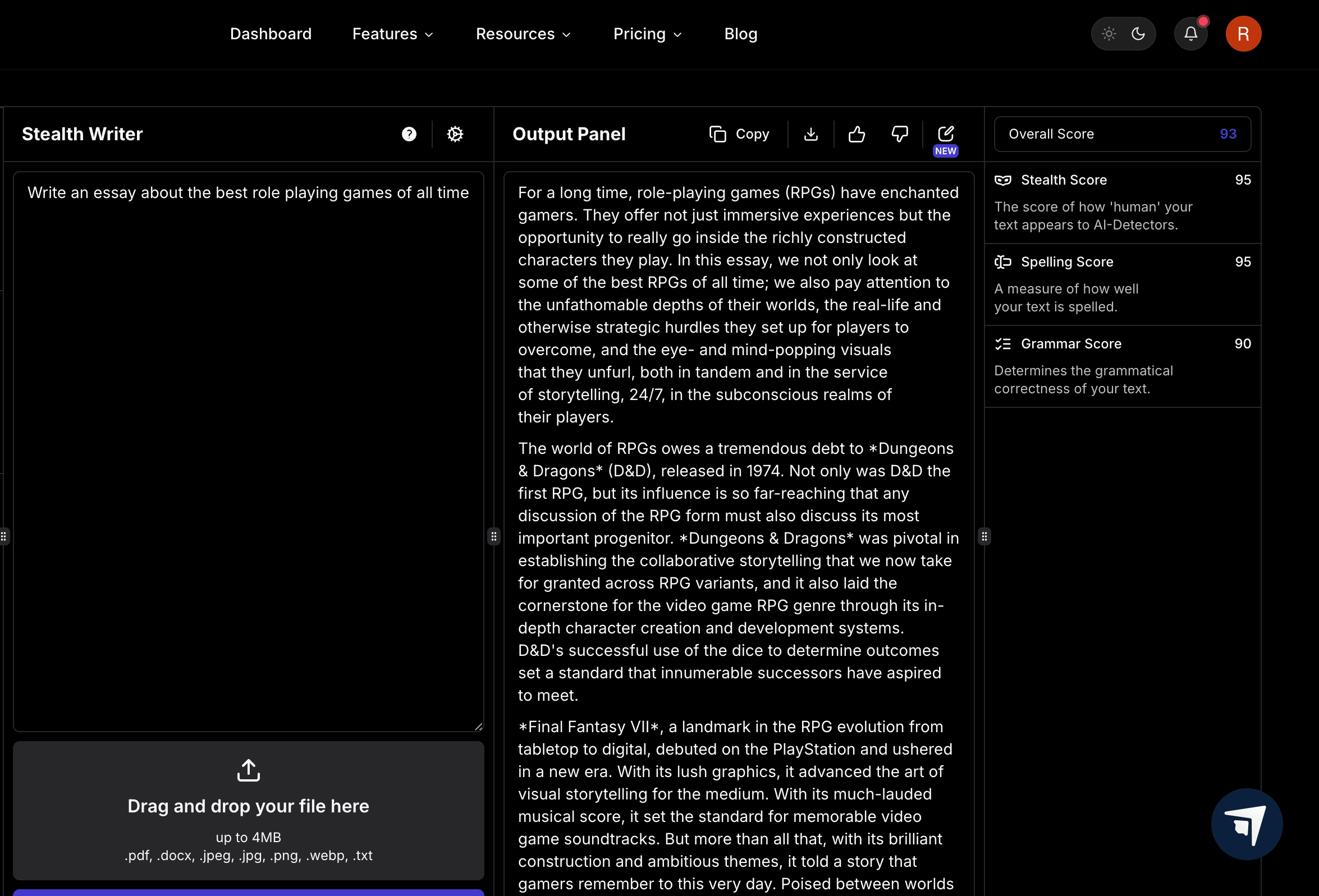 We can either humanize AI content from ChatGPT using StealthGPT’s bypass tool or generate our own undetectable essay with Stealth Writer, StealthGPT’s AI writer. Lets see what StealthGPT thinks are the best role playing games of all time: