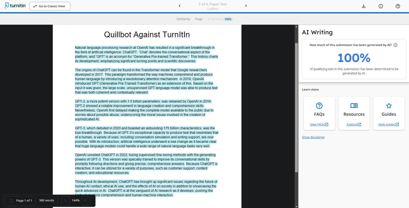 Quillbot receives a 100% AI detection score through TurnItIn. Which means it could not bypass TurnItIn. Before drawing any conclusions, let's assess how effectively StealthGPT can navigate through TurnItIn.