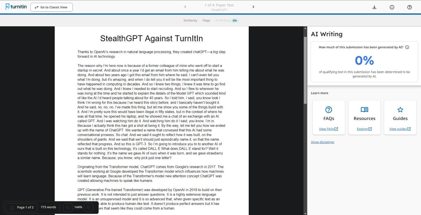 StealthGPT continues to break all odds and achieves over 0% AI written content on TurnItIn. It can successfully evade AI detectors, unlike Quillbot, which struggles to bypass TurnItIn.