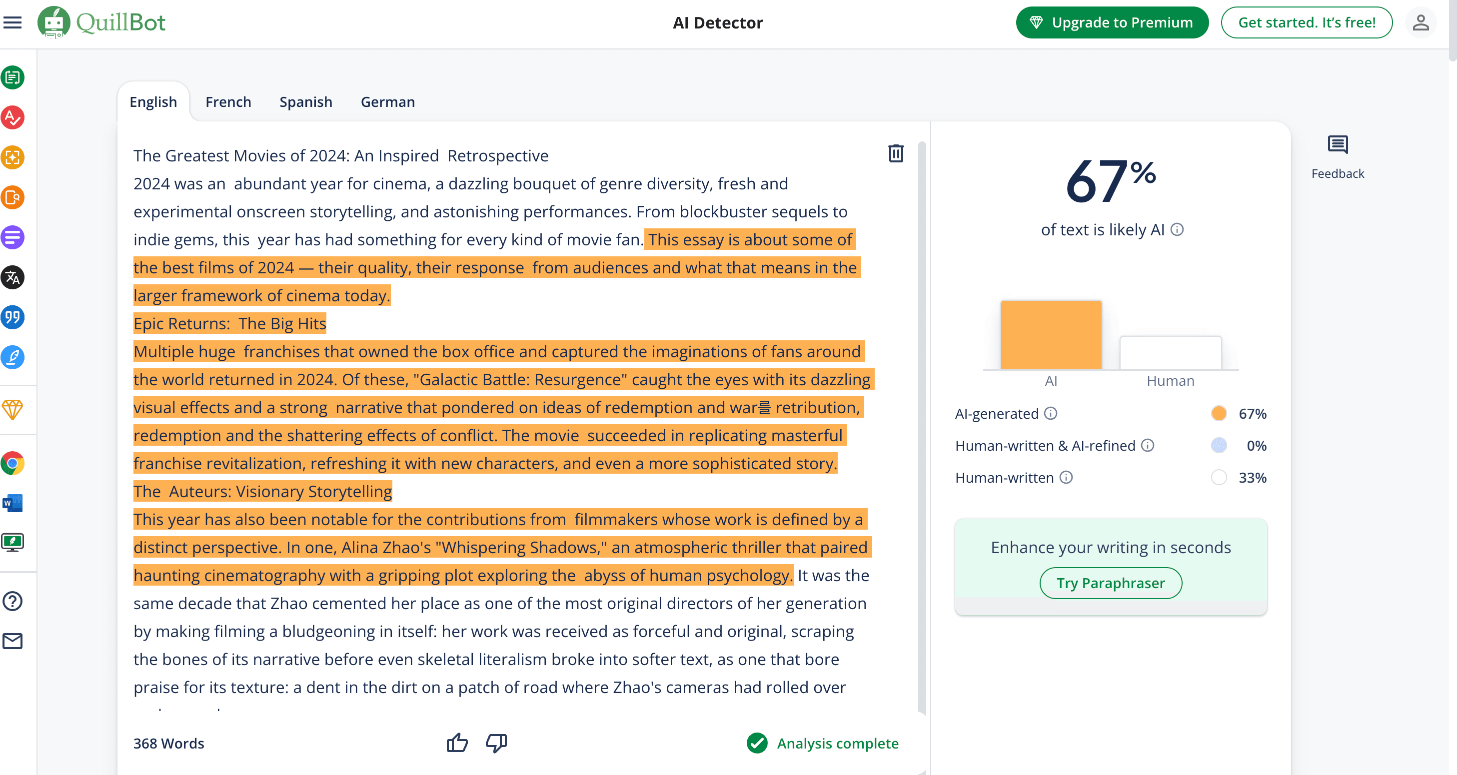 Quillbot determined Rewritify’s text was 67% AI and 33% human. The content gets a “D”.