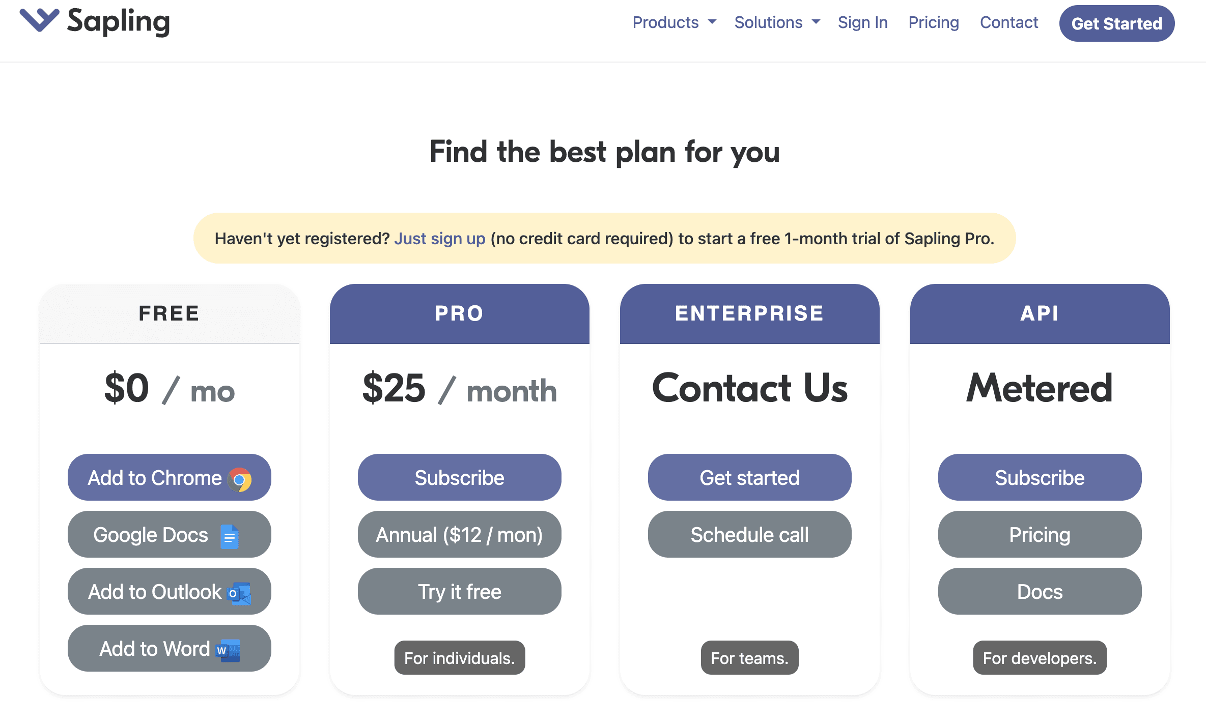 What distinguishes Sapling.ai’s free version from the paid version seems to be character limits. The free version allows for only 2,000 characters, but if you sign up for a free trial, you can get the Pro Plan for 30 days. Here’s a screenshot of their pricing if you’re interested: