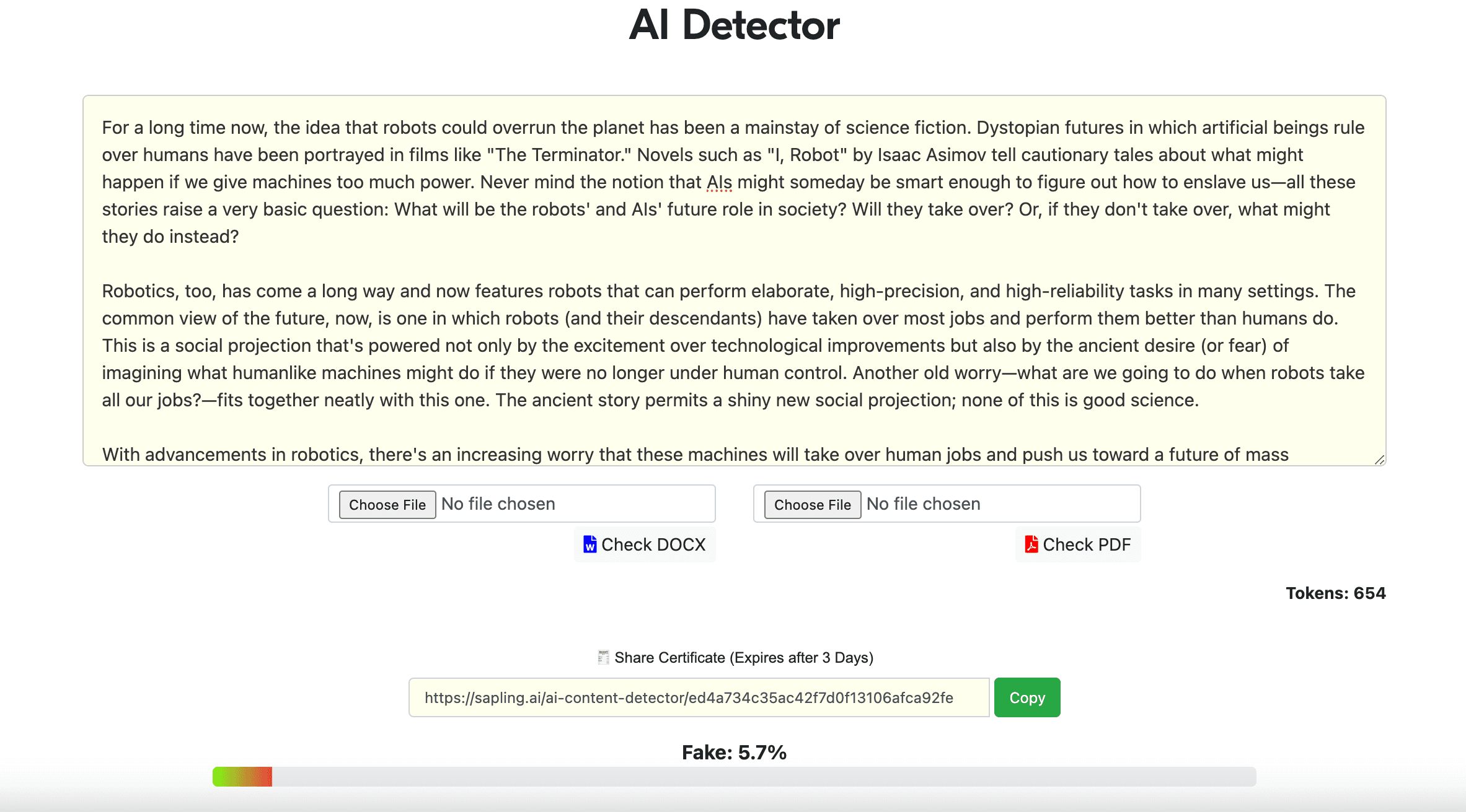 Ladies and gentlemen, we got detected. 100% too! That’s pretty impressive. It may not be the most convenient interface but Sapling.AI gets points in basic functionality.