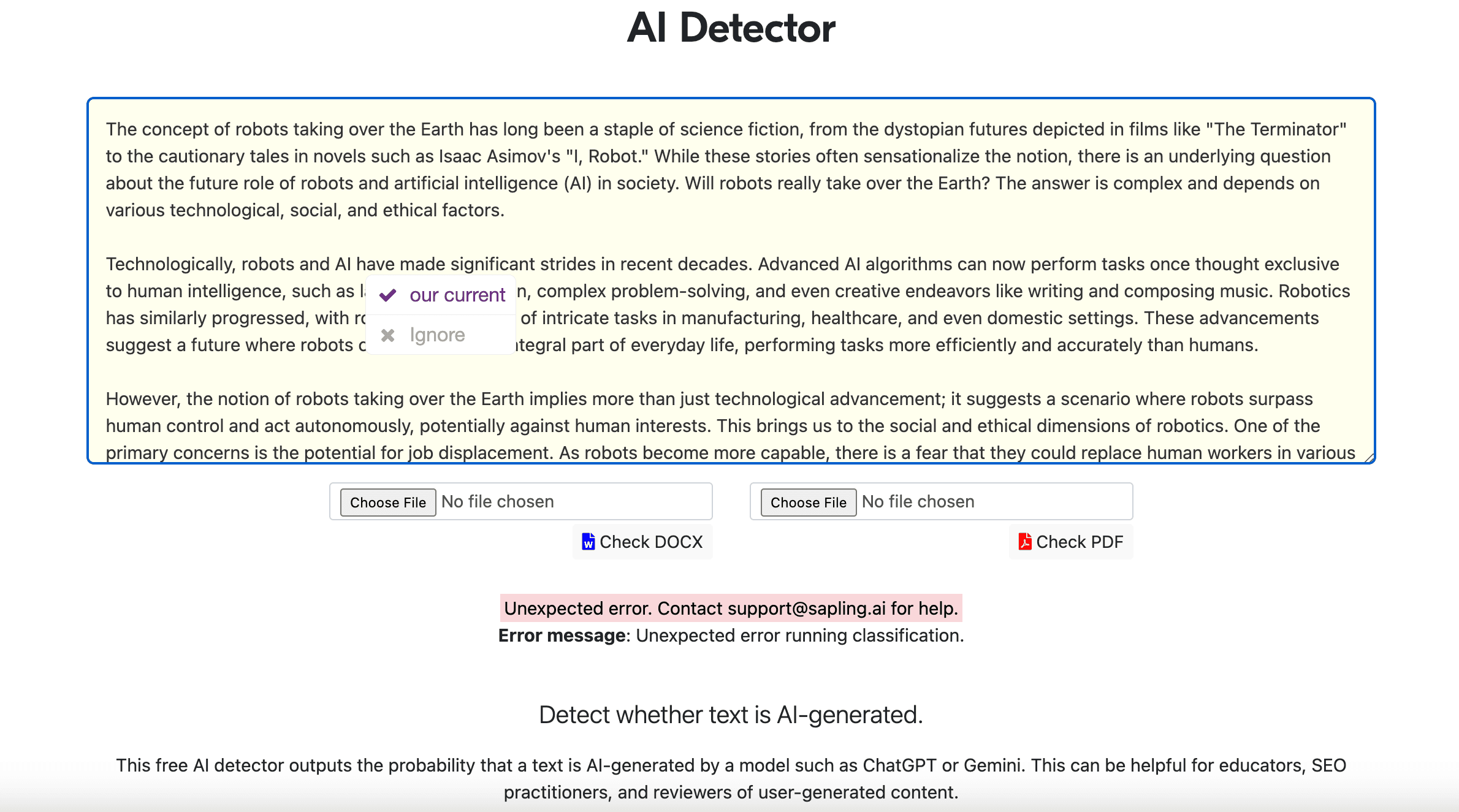 At first, the AI detector tool didn’t make it clear if I could simply copy and paste my AI-generated text into the dialogue box. I gave it a go anyway, hoping I wouldn’t have to upload a file and it worked. Sadly, it still gave me an error. As you can see here: