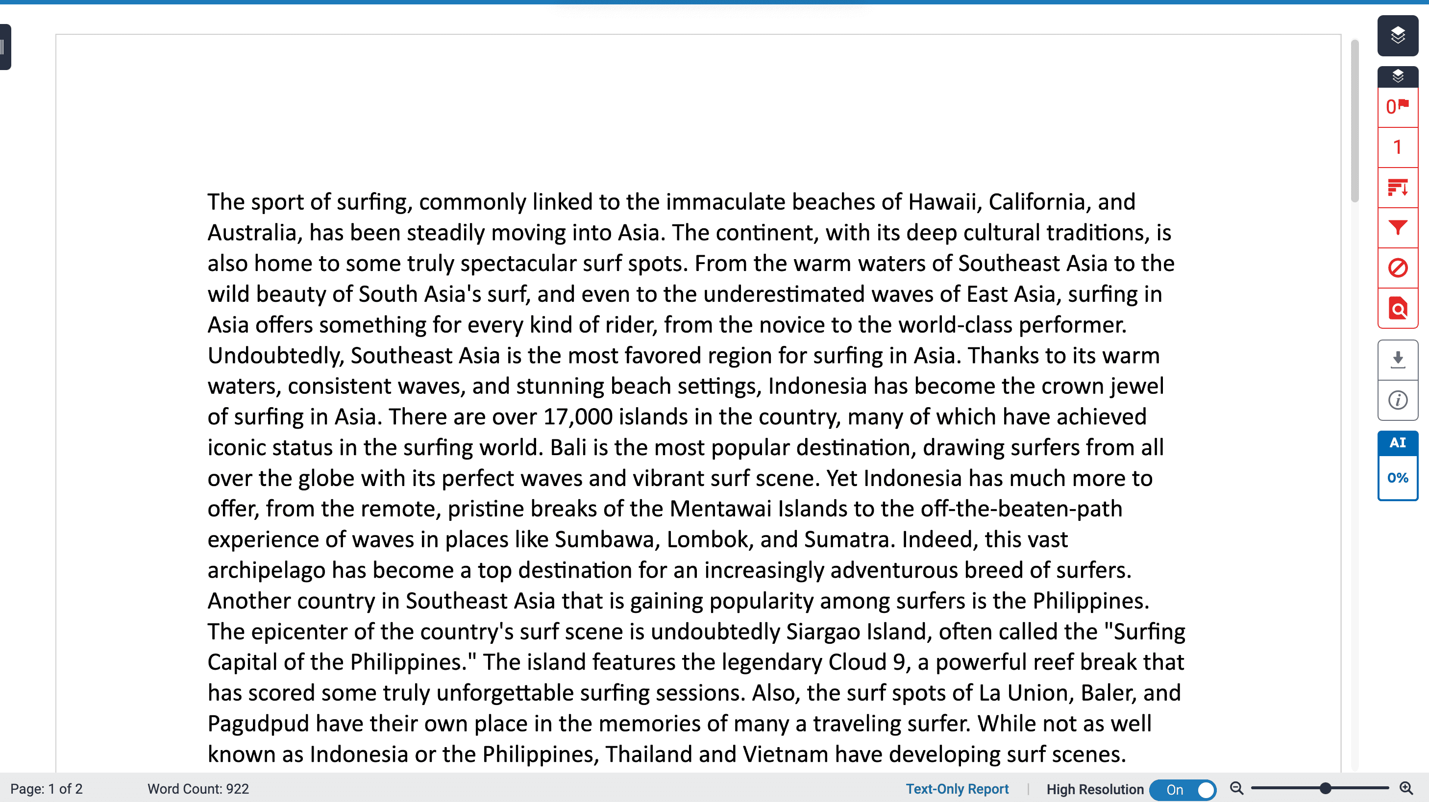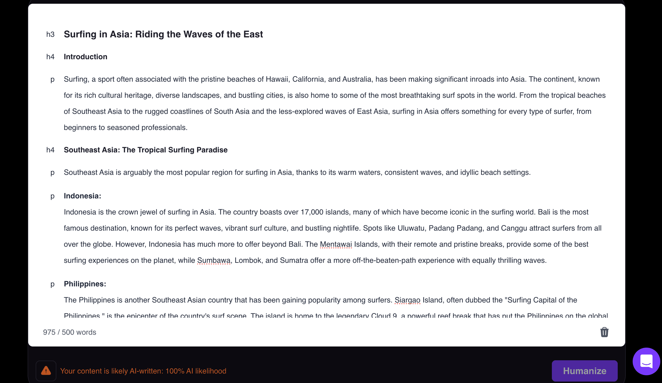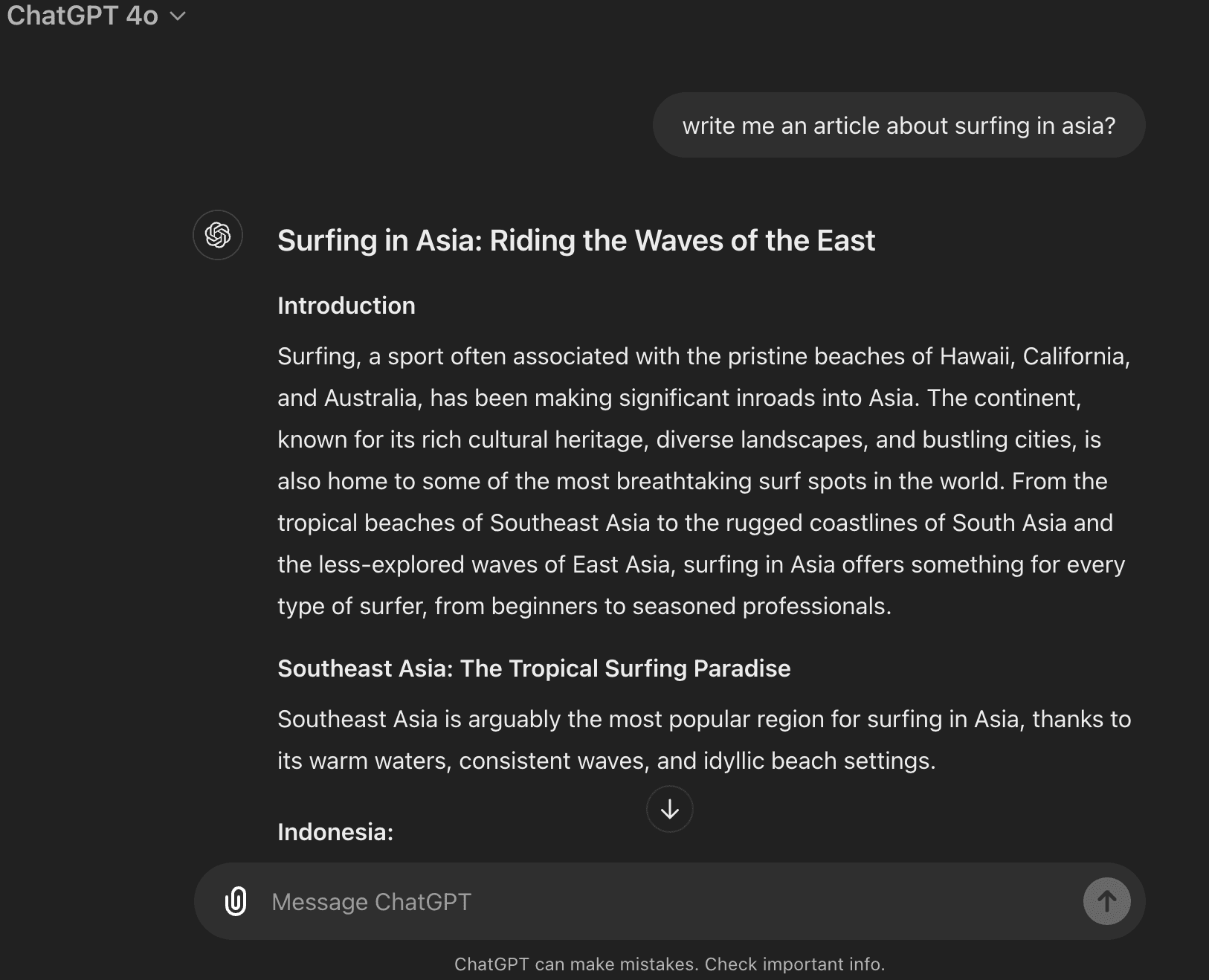 So, lets create some AI generated content with ChatGPT. We’ll make an article about surfing. Here’s a snapshot of it: