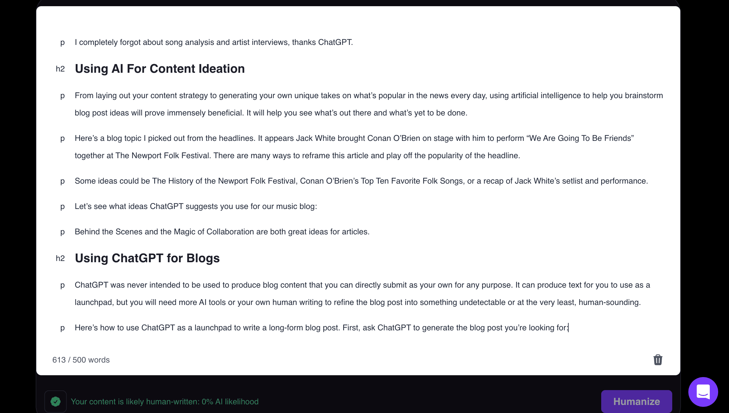 Because I’m wary of the speed in which SurferSEO gave me a result, I’m going to feed it an article I wrote from our blog about how to use AI to run a blog and see if it will flag it as AI writing.