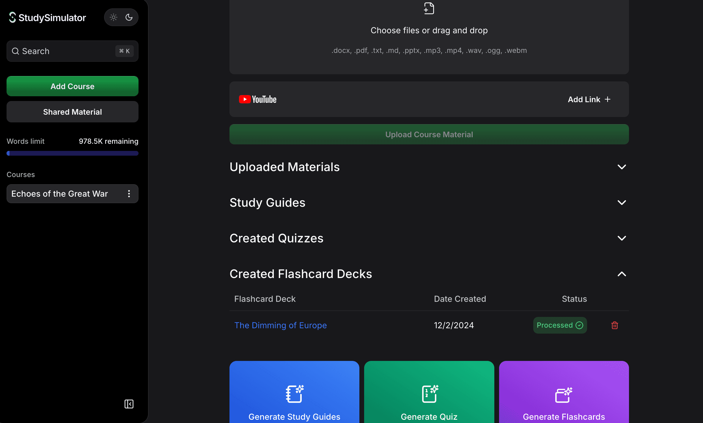 For this example, lets upload a Youtube link to a documentary about World War 1. Once fully uploaded, simply click the "Generate Flashcards" and wait a moment. You can now click on and access your flashcards, ours are named “The Dimming of Europe”.