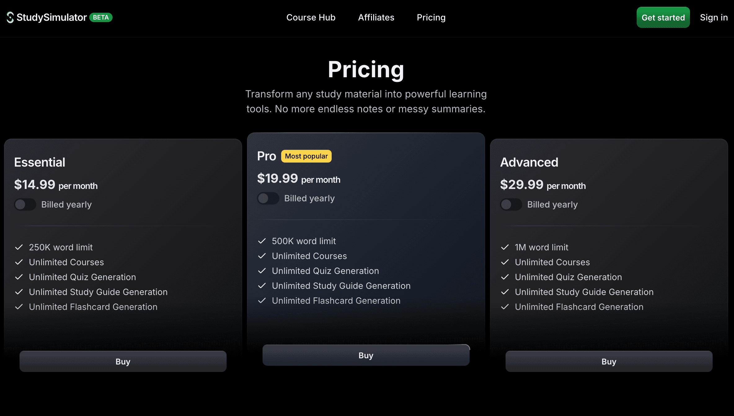 Pricing for The Study Simulator varies by how many words you upload at a time. No matter which plan you choose, you can generate unlimited study tools from them.