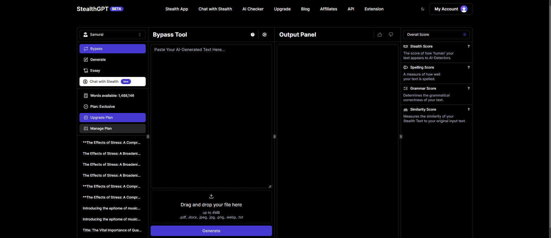 To generate not only fresh, original, and undetectable content on StealthGPT. All you need to do is use the Stealth Generate Tool. This tool will allow you to generate prompts from scratch based on the length you want it to. Just simply provide any request to Stealth Generate Tool and wait for that perfect product; it just takes you a few seconds.