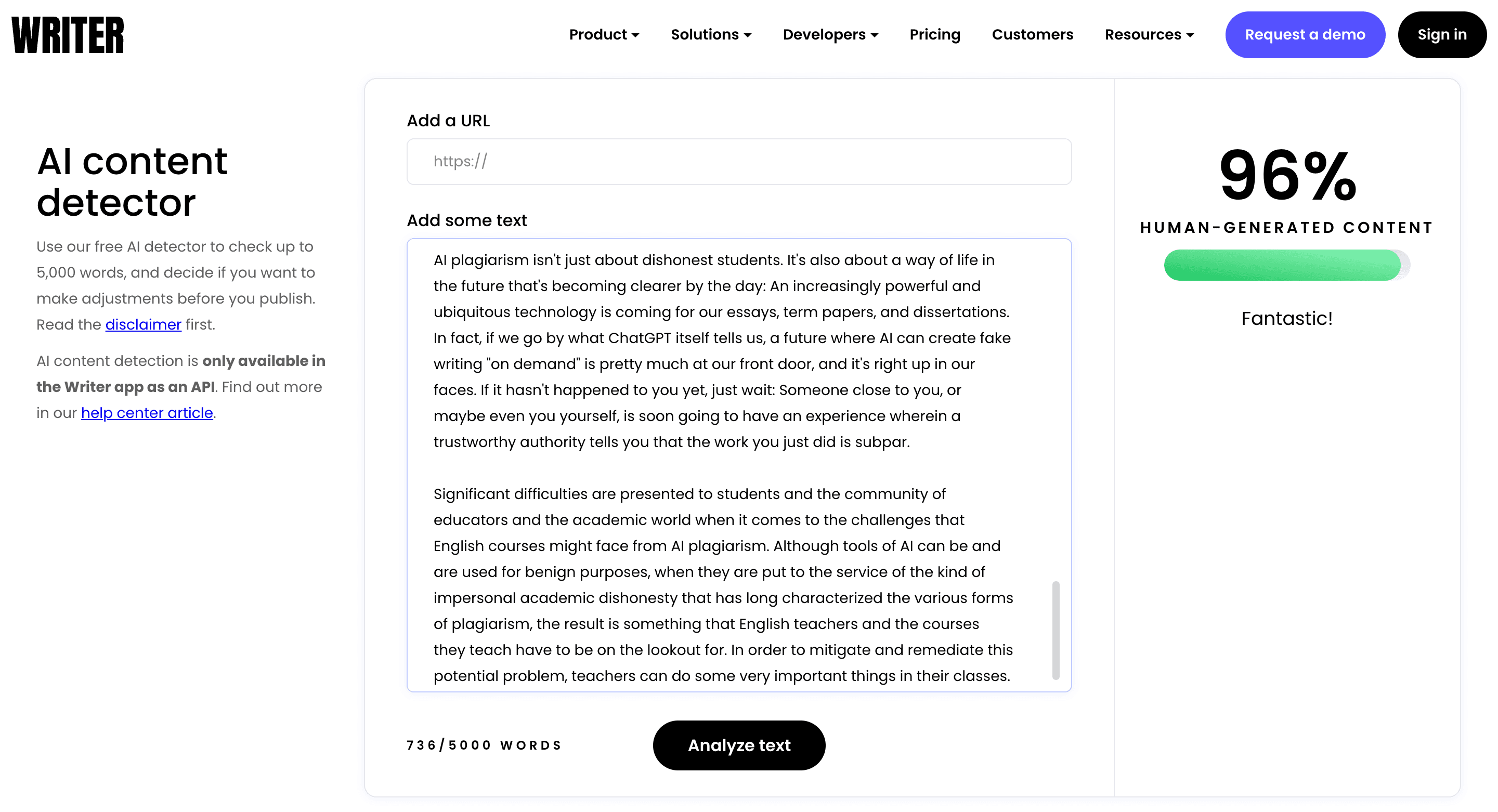 With a Human score of 76%, only 24% of the essay was determined by Writer to be AI-generated content. So, Writer did a shockingly poor job. To compare, most free AI detectors will give you a 100% score when passing ChatGPT. So, if you’re professor is using Writer, your students can pretty much hand in anything from artificial intelligence and have a shot of passing.