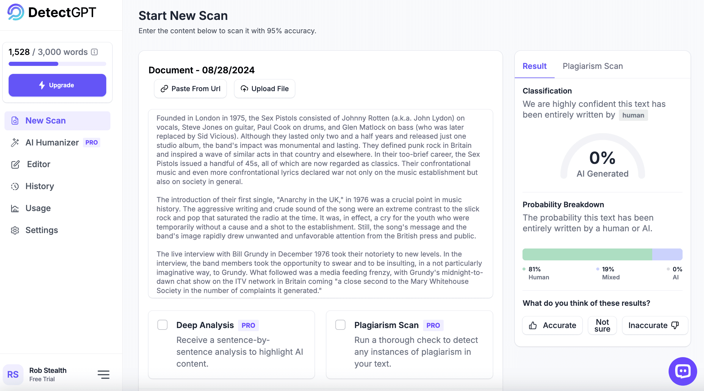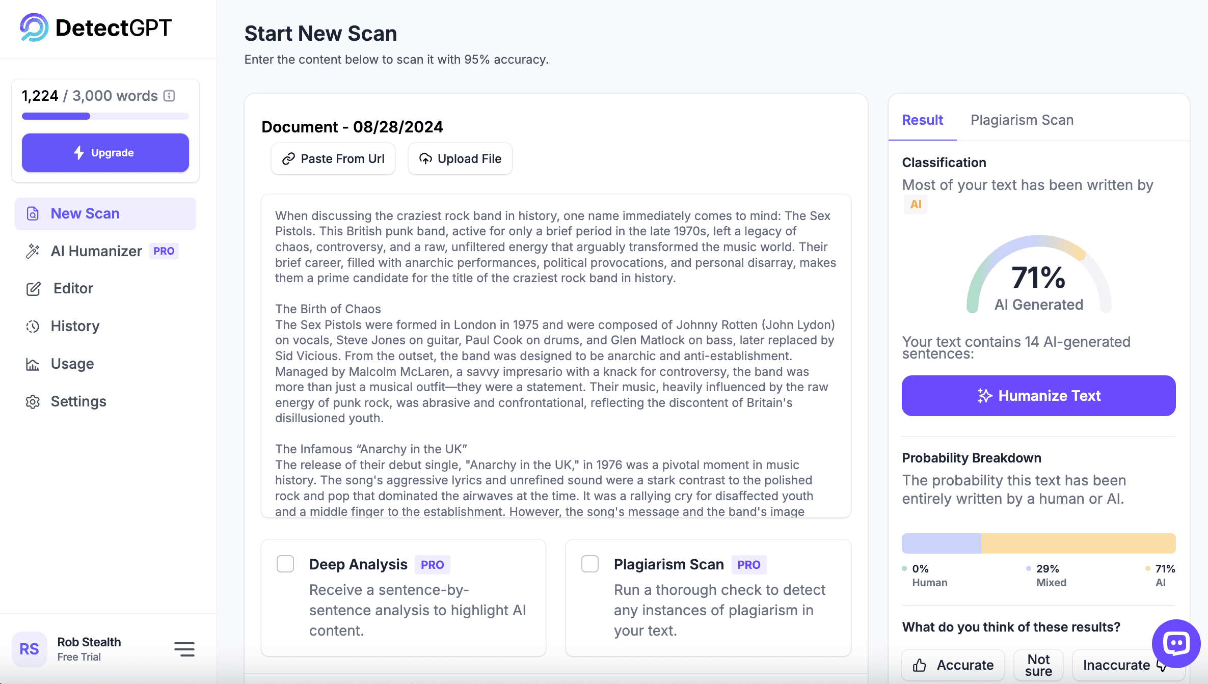 Let’s pass StealthGPT’s Sex Pistols essay through DetectGPT’s AI detector and see what we come up with: