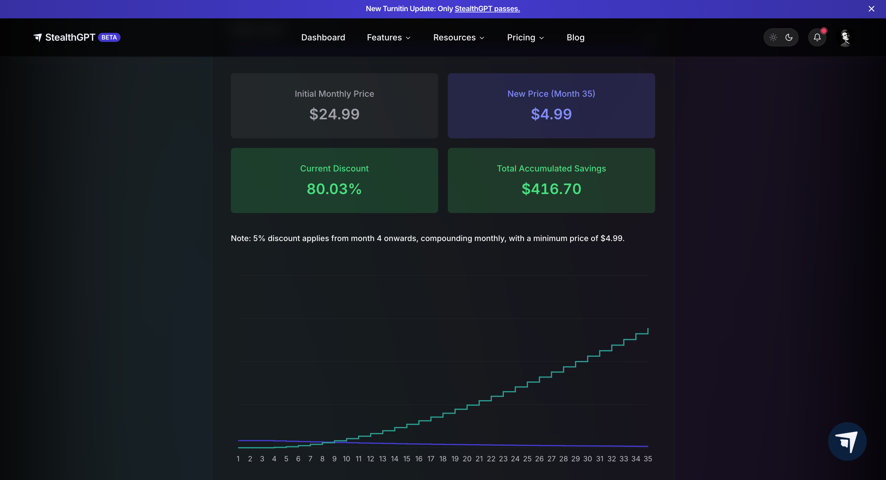 Because StealthGPT is always thinking about users first, every pricing plan can be discounted using our innovative Staircase pricing model that allows users to save money the longer they hold a subscription.