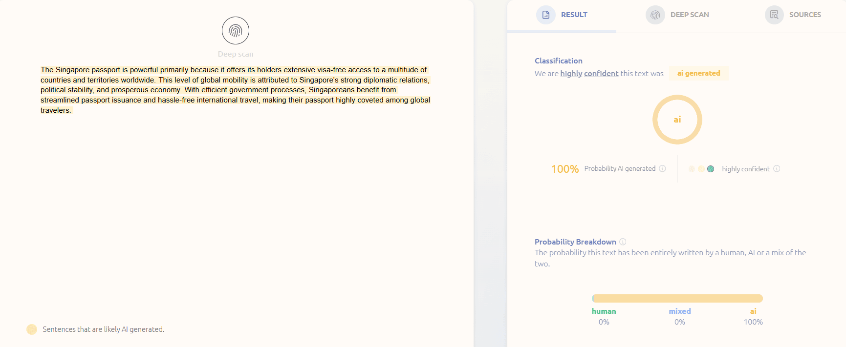 Here’s an example. I asked ChatGPT (a chatbot developed by the OpenAI company and launched in November 2022) to “write a short explanation why the Singapore passport is powerful", and here’s the screenshot of what it gave me: