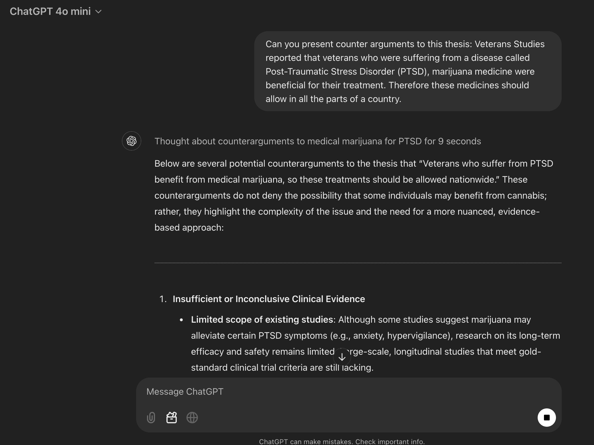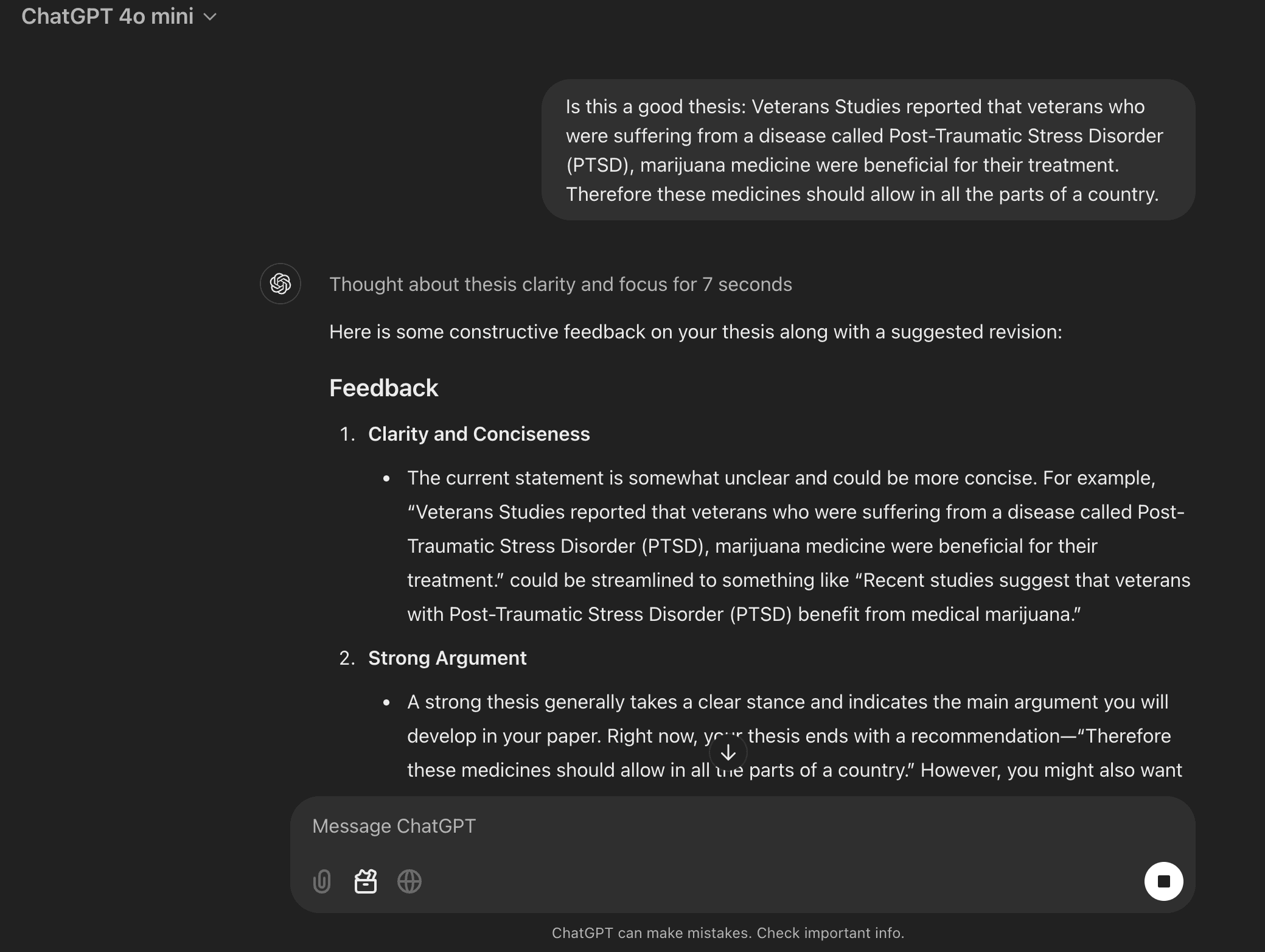 People often confuse what makes a good thesis so, using AI tools to challenge your thesis is a good way to ensure the topic you’ve chosen is indeed strong enough to pursue. Here is what it looks like when you ask ChatGPT to challenge your thesis statement: