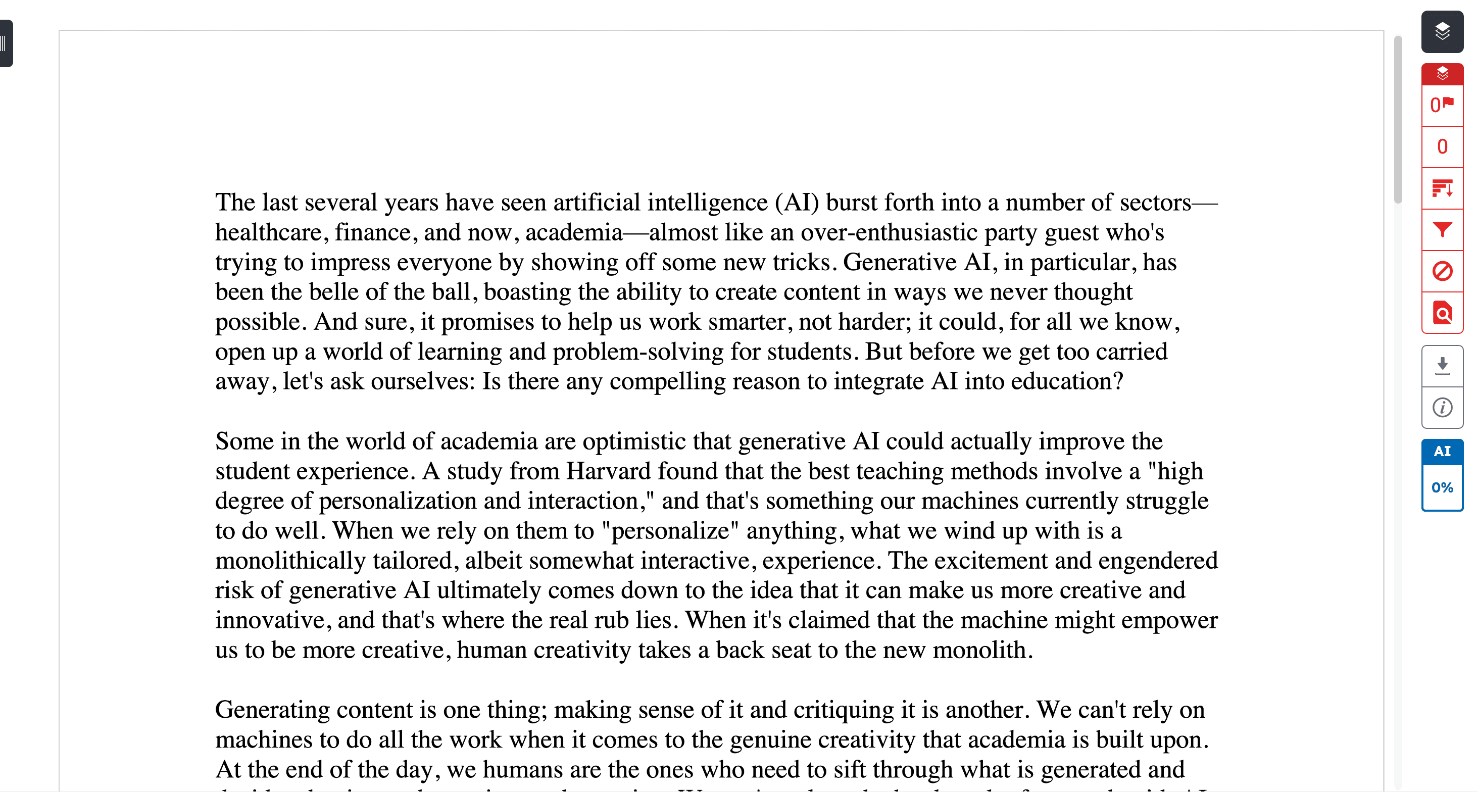 The first thing you can do is ask AI to critique it for you and even fix it accordingly. I had ChatGPT write an essay about AI in academia, here's what it thought of it's own work: