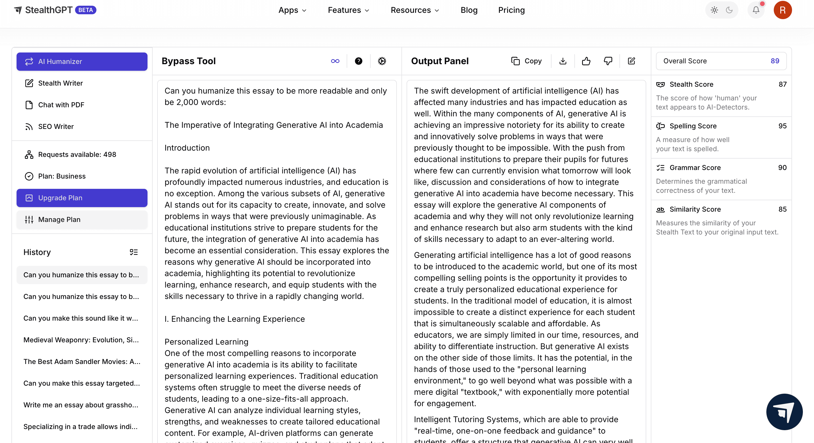 Now we have two versions of a college essay written by Stealth AI’s two main features. These essays would be able to bypass AI detection on their own, however, to fully protect yourself from plagiarism accusations and ensure your submitting the best essay possible, there are additional steps you should take.
