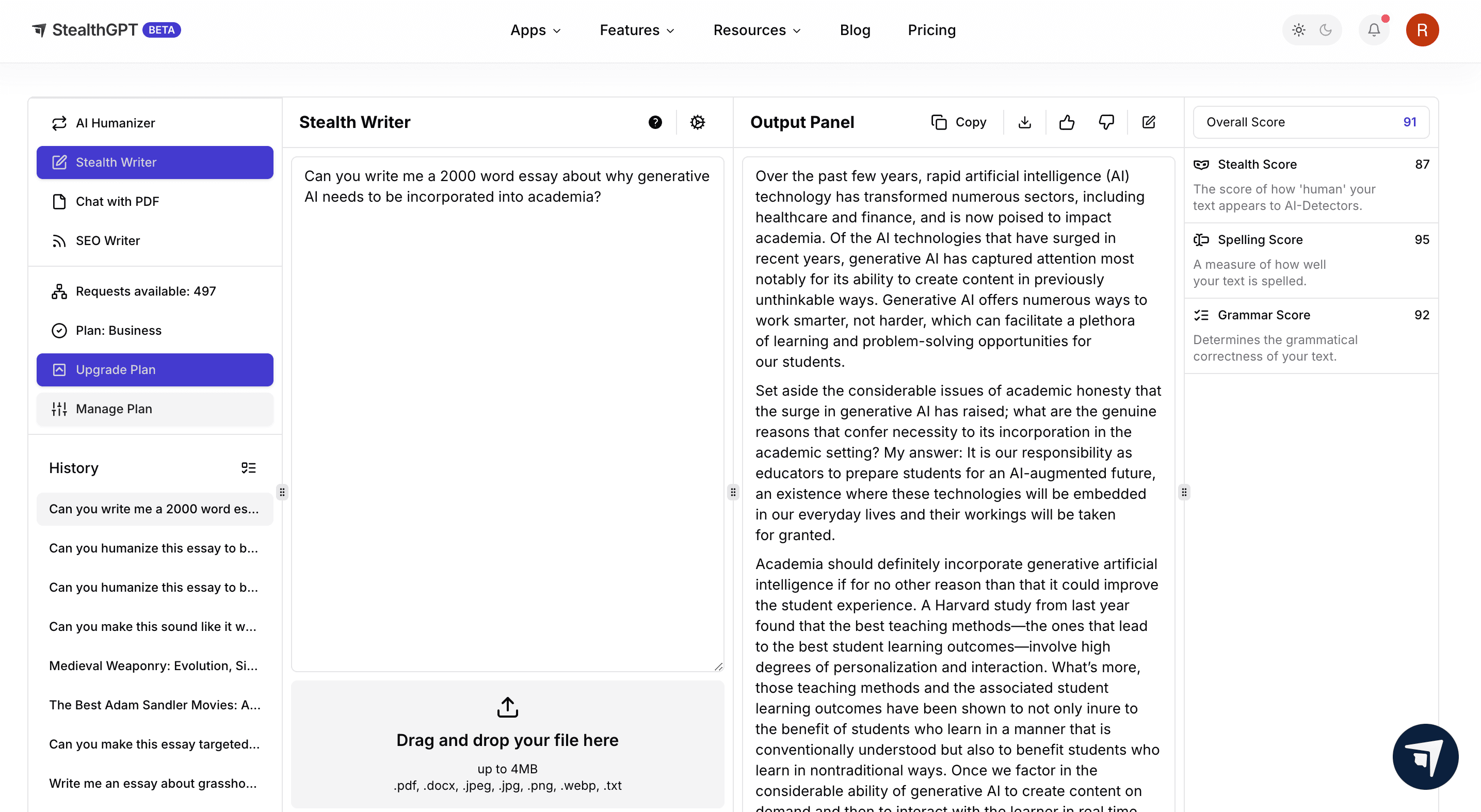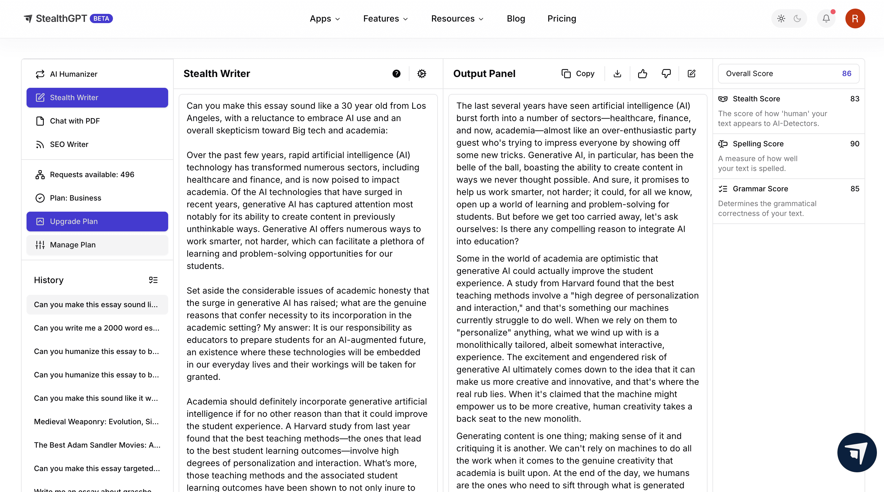 Whether you had ChatGPT to write an essay that you need to be humanized or you want to use Stealth Writer to generate your essay from scratch, StealthGPT is a one stop for all your academic writing needs.