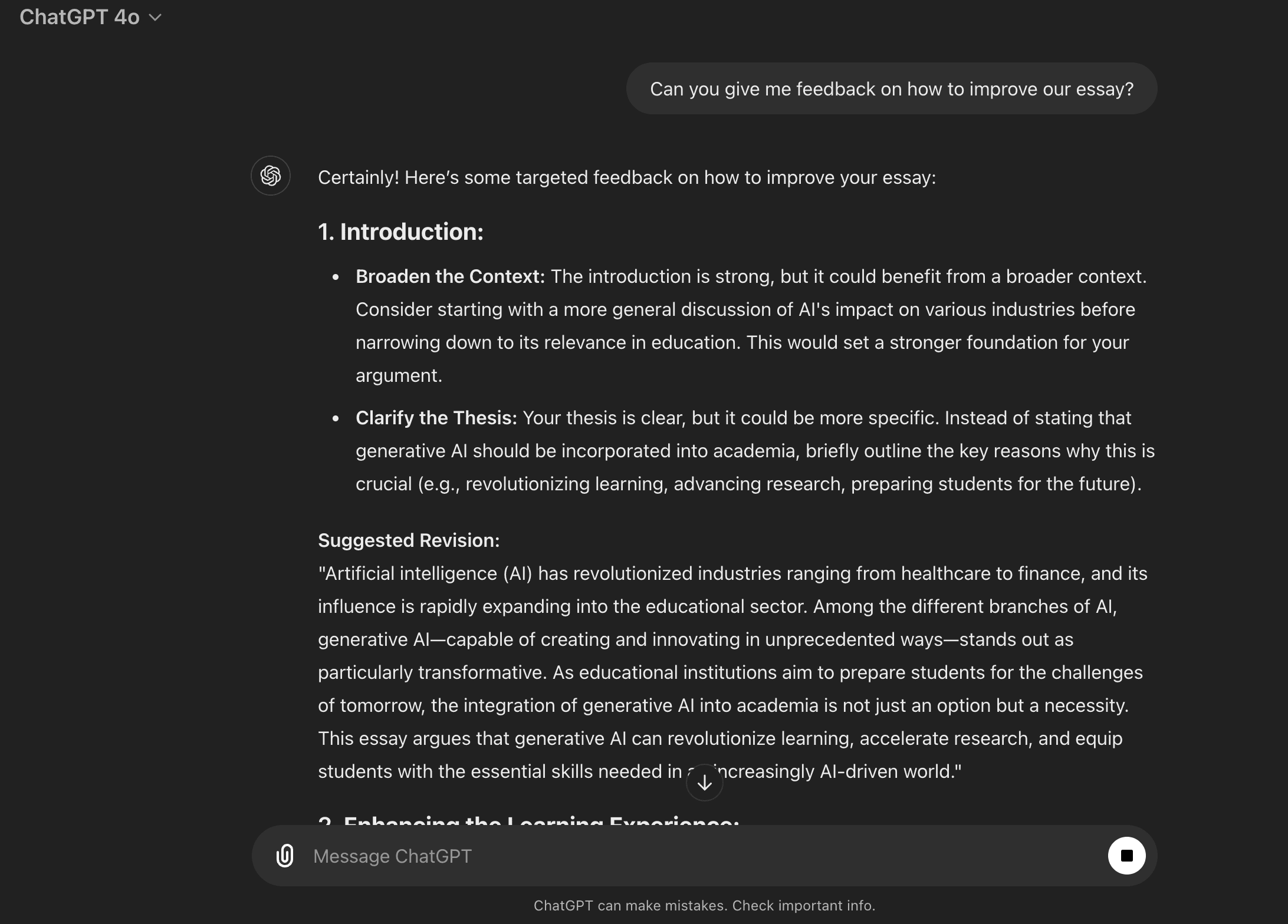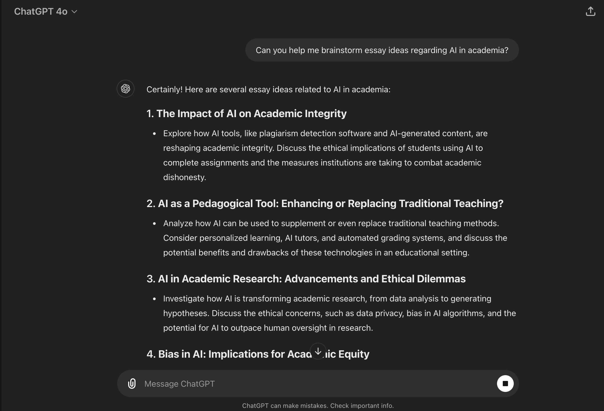 Let’s say you have an essay due soon and for the life of you, you can’t think of what to write about. You don’t want ChatGPT to ghostwrite the essay, but you're not opposed to using AI for tasks like proofreading. One thing you can do is ask ChatGPT for help brainstorming essay topics and theses for you. Here’s a sample of how ChatGPT brainstorms ideas for you: