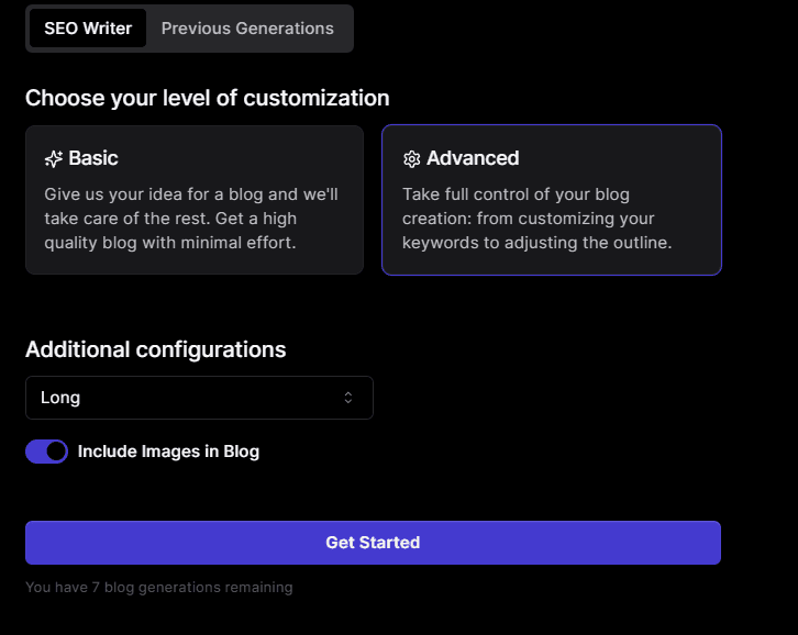 When you first access SEO Writer, you’ll be asked to pick your level of customization. The two available options are Basic and Advanced. If you’re looking for the quickest option, Basic is the way to go. Just enter your prompt and keywords and we’ll take care of everything else. Now, if you’re looking for a bit more customization, you want Advanced. This will let you continuously edit your product until it’s perfect for you. Great for all the professional writers out there.