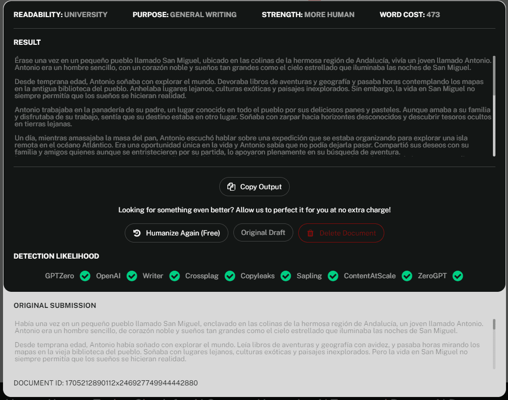 Como pueden ver, la Característica de Detección Inteligente de StealthGPT que maneja todos los idiomas, fácilmente rehace el texto para que sea indetectable. Ahora probemos a nuestros competidores y veamos si sus modelos pueden hacer que el texto generado en varios idiomas sea indetectable. Primero: AI Indetectable.