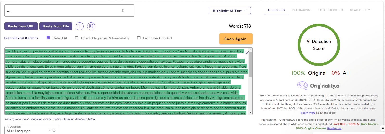 Actualmente, Originality AI es uno de los únicos modelos de Detección de IA con una configuración de detección multilingüe. Veamos si este texto elude su modelo:
