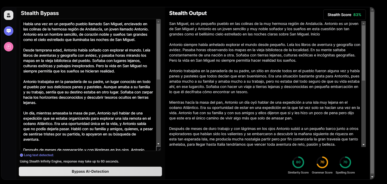 No necesita hacer nada especial, simplemente traiga su texto a StealthGPT y colóquelo en nuestro cuadro de entrada. Detectaremos automáticamente en qué idioma está el texto y la salida coincidirá con el texto.Aquí hay un ejemplo de texto en español.