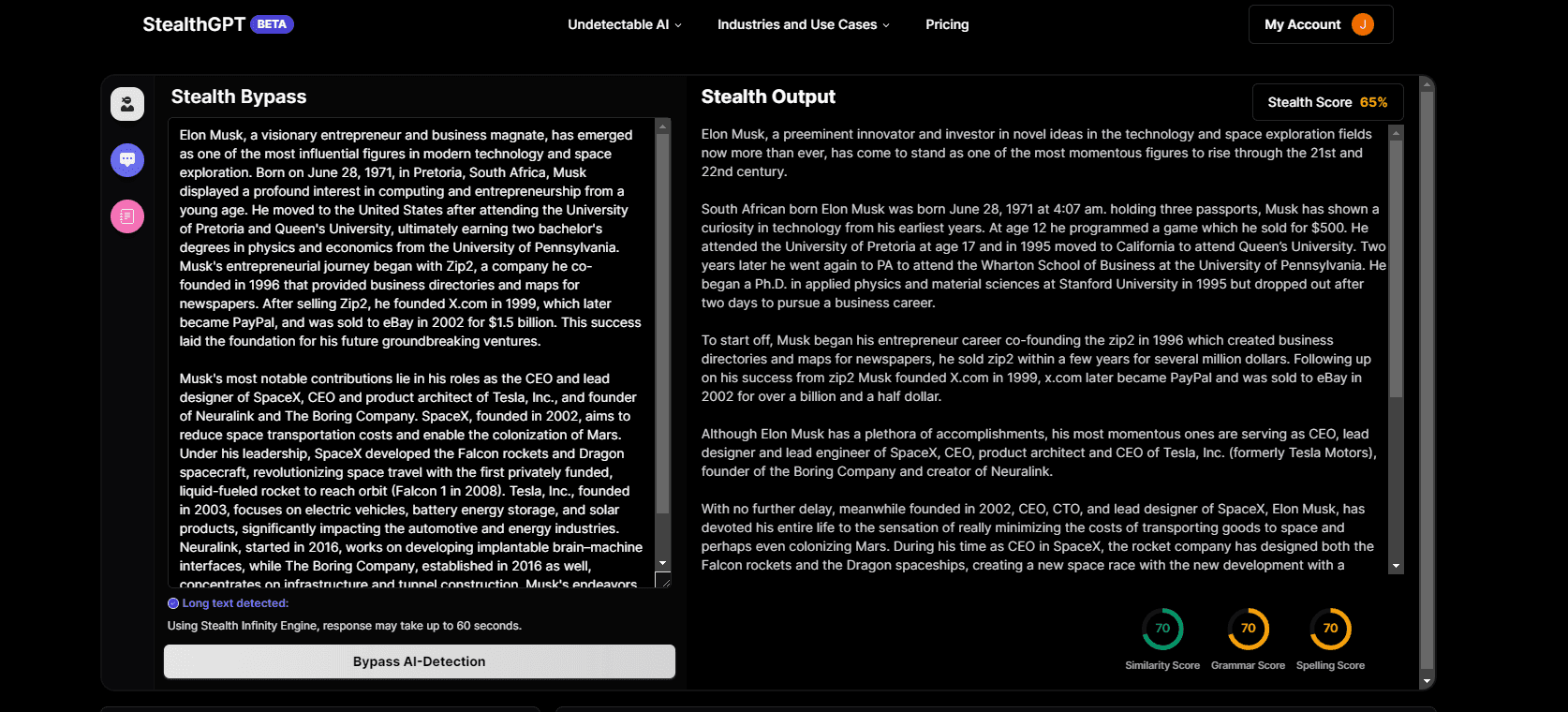 1. New foundational models and processes: We have built completely new models from scratch over the last month and a half. These models and processes are much better than the previous iteration of StealthGPT outputs. While still not perfect, these models are far better at scoring on: Similarity (how close is the new content to the old content), grammar, spelling, and of course undetectability. StealthGPT's primary goal was to become the most Undetectable AI and we have accomplished that as many articles has showcased. After completing that goal the next mission was to greatly improve our output quality. These new models and processes have brought us significantly closer to our goal but there's a lot of room for improvement.