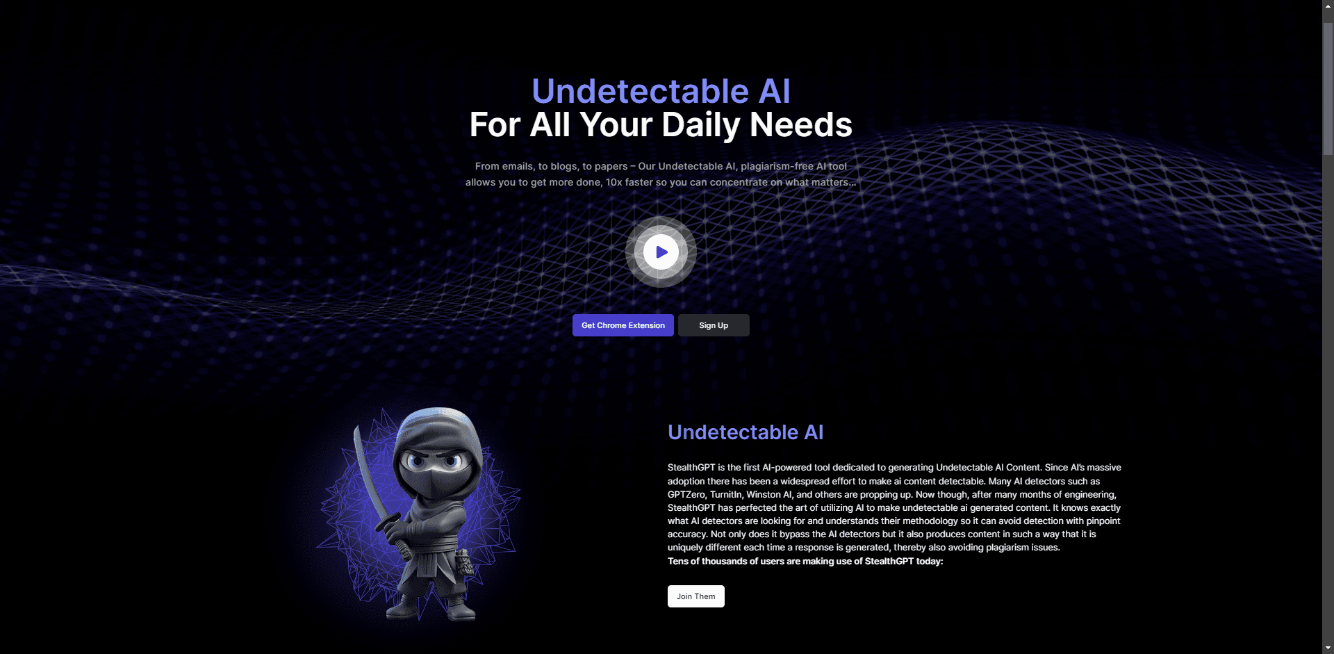 First of all, say hello to an updated StealthGPT landing page, with a robust nav bar (not pictured) and our update our friendly ninja mascot. The StealthGPT landing page and several other pages have been dramatically updated to showcase our growing brand and reputational strength. Expect more aesthetic updates to the landing page, and possibly some changes to the App to come ;)