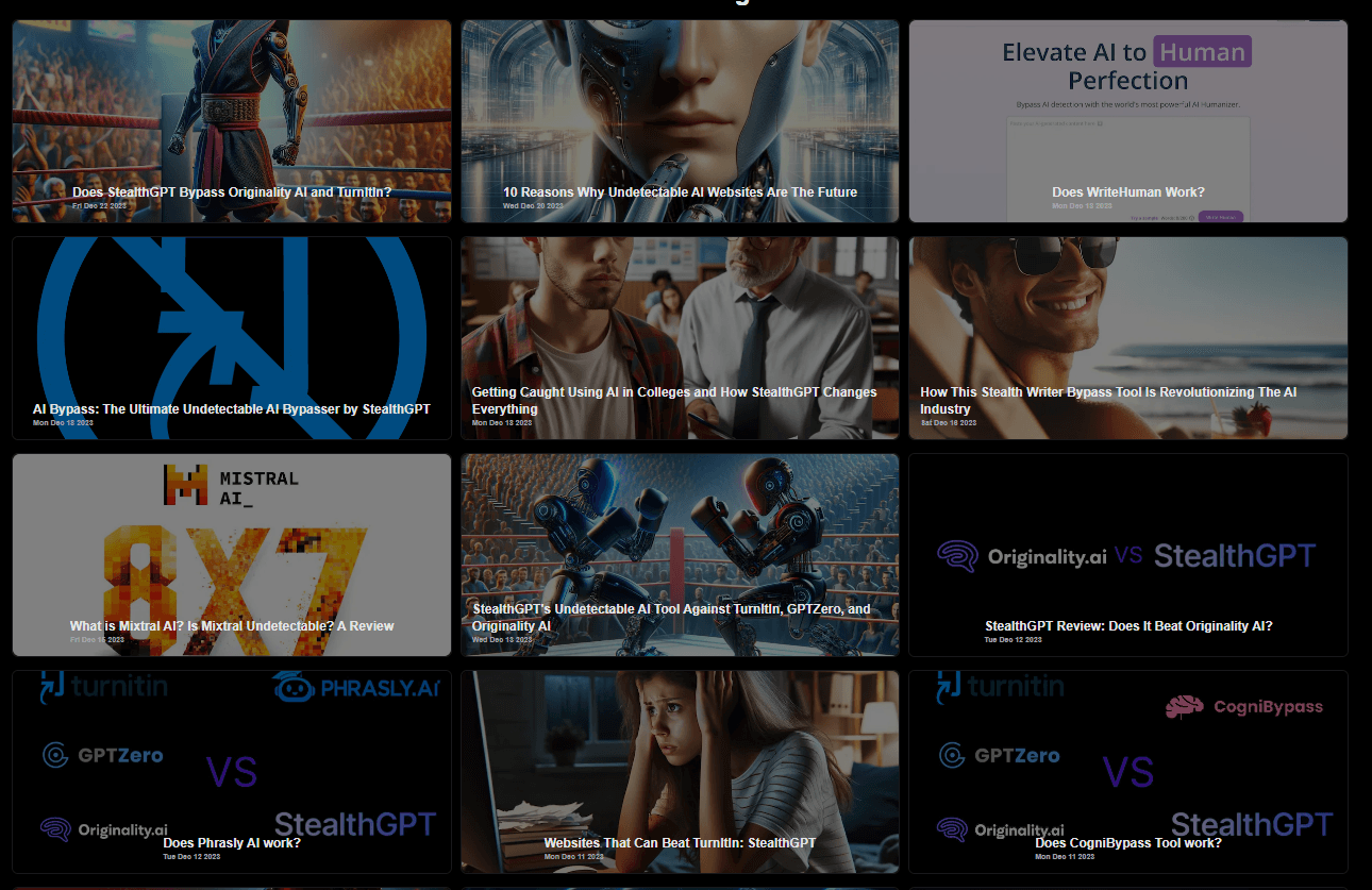 This month we created several interesting blogs that covered our competitors, new LLMs, and even StealthGPT itself to see who holds the true title for Undetectable AI. A lot of services will say it but many fail the task. We covered tools like Cognibypass Tool, Phrasley AI, WriteHuman, and new, hot LLM's like Mixtral. Every month we will show off how StealthGPT performs against the best AI Detectors, and we will also be looking into our competitors to see how they hold up as well. We will also test new, popular models to see if they naturally can bypass AI detection. You can count on our team to give you the latest information you need to know about the Undetectable space.