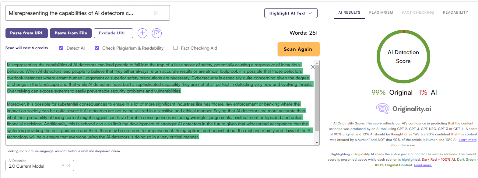 And the results speak for themselves. Again you can see in the full screenshot the text that we used against Originality AI. Now their team can go back and validate our claims are true. And on goes the cat and mouse game! But we know the game better :)