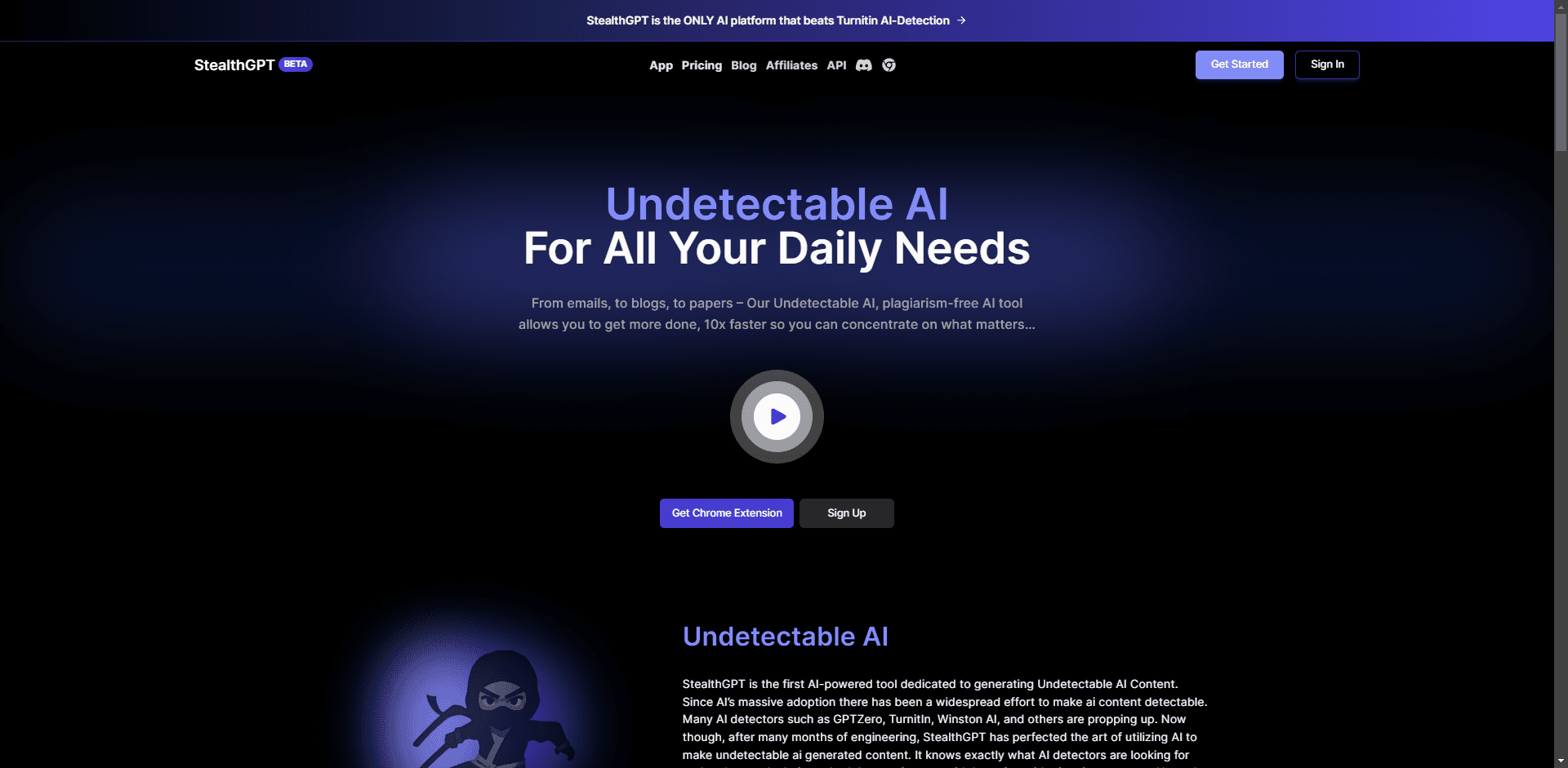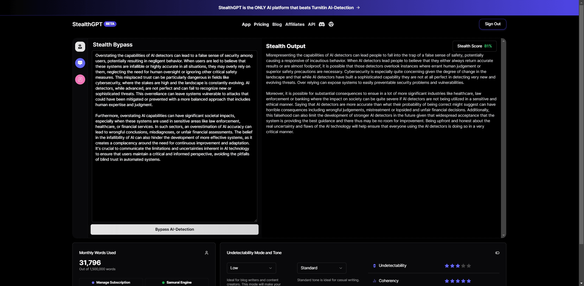 StealthGPT is an Undetectable AI service that allows users to create undetectable text or rewrite text to be undetectable. It is one of the most proven tools on the market. Consistently scoring the highest against AI detectors in its cohort. It features three tools: The StealthGPT Bypasser -- rephrases text from services, like ChatGPT, to be undetectable, a Content Generator -- which takes in prompts and produces undetectable responses, and a Essay Generator -- which creates Undetectable AI long form essays.