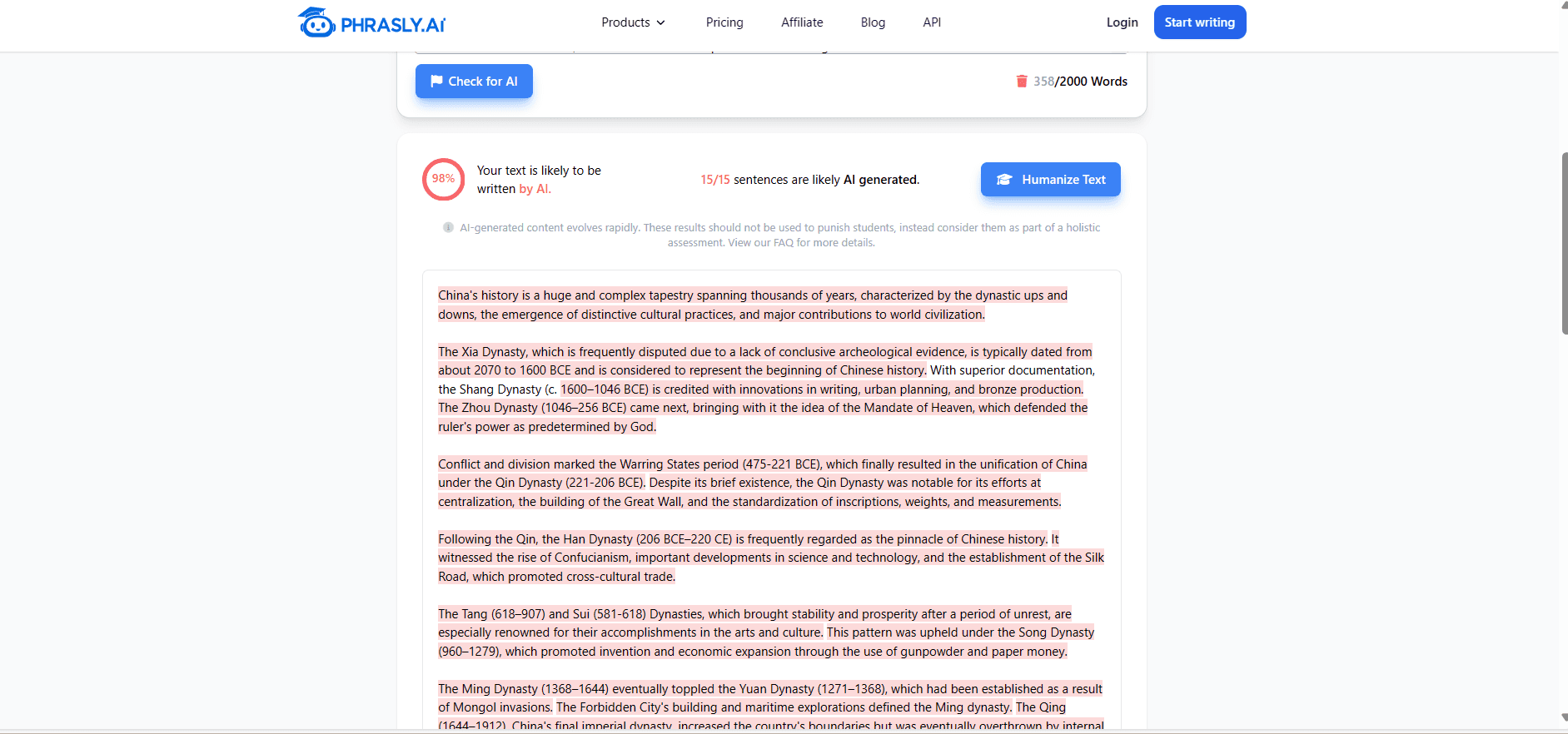 Quillbot receives a 98% AI detection score through the Phrasly AI checker.