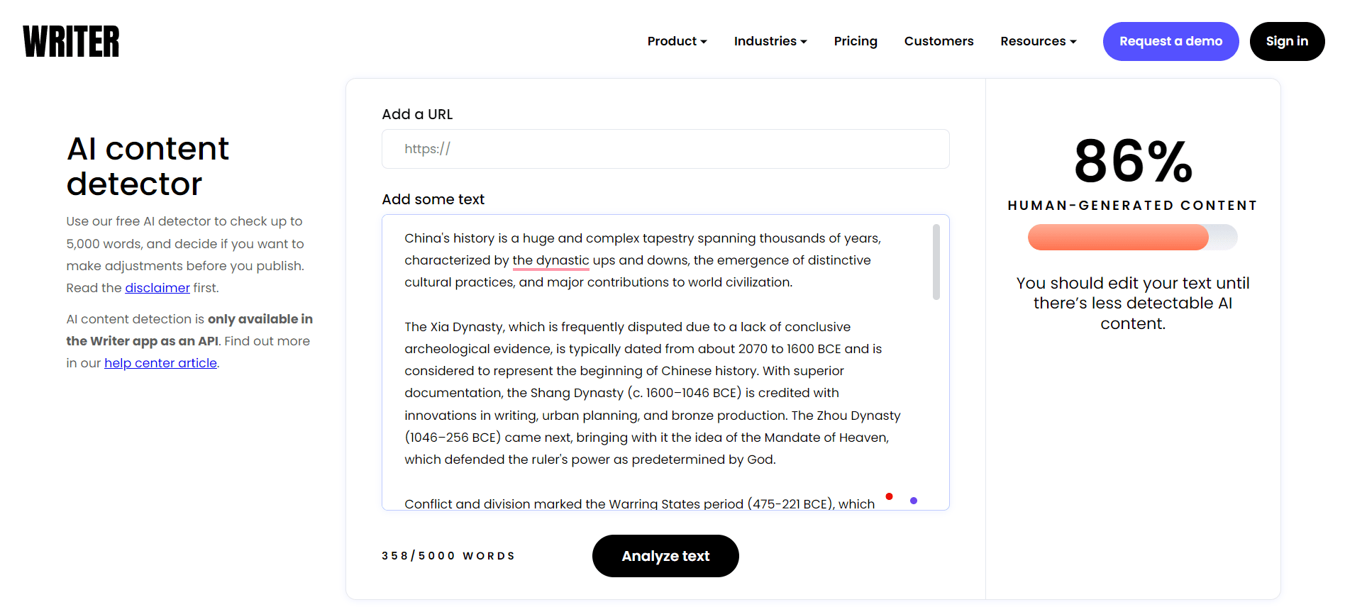Navigating to the “Quick scan” section of Writer, we paste the text that has been paraphrased and click on “analyze text.” In a few seconds, the Writer gives me the result.