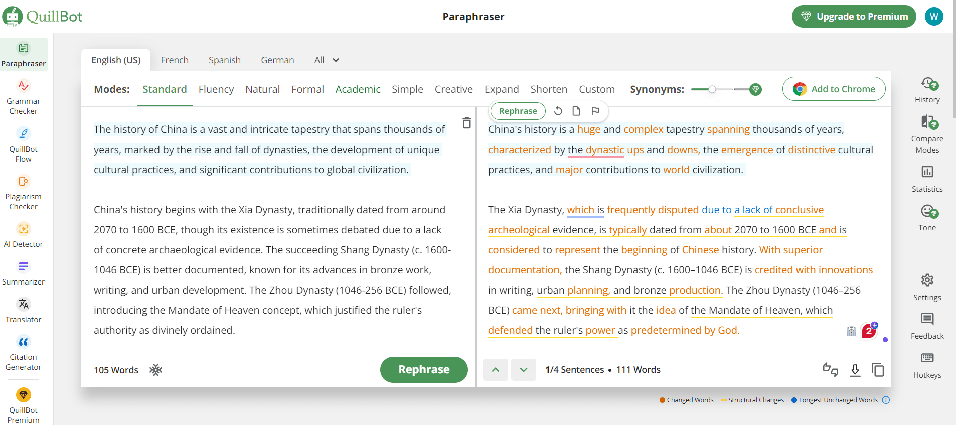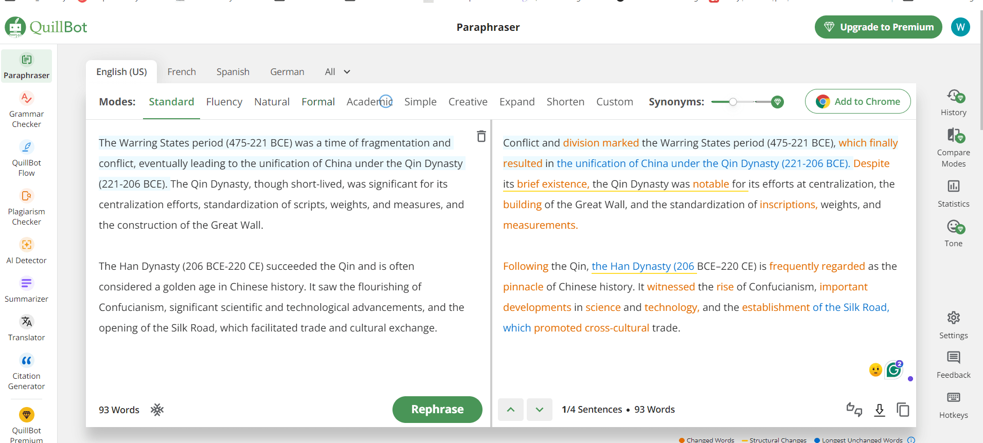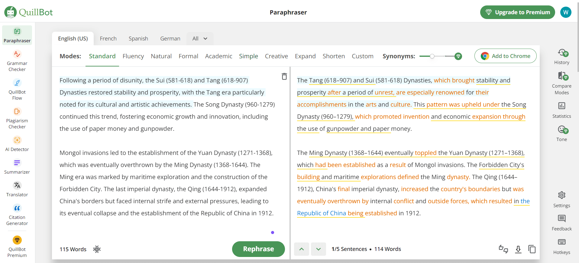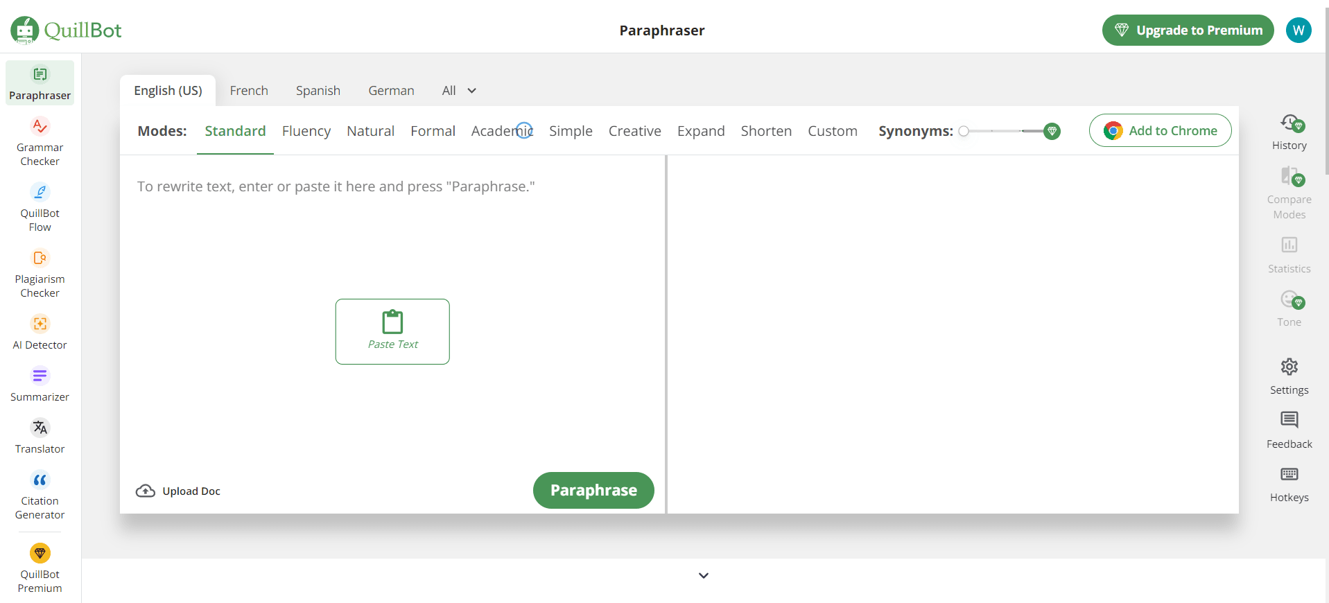 Paraphraser: This is the highest-rated feature on Quillbot. Paraphrasing is the ability to rephrase text using synonyms while maintaining accuracy and preserving its key message. The free version will provide users with two ways to convert their message which are: Standard and Fluency.