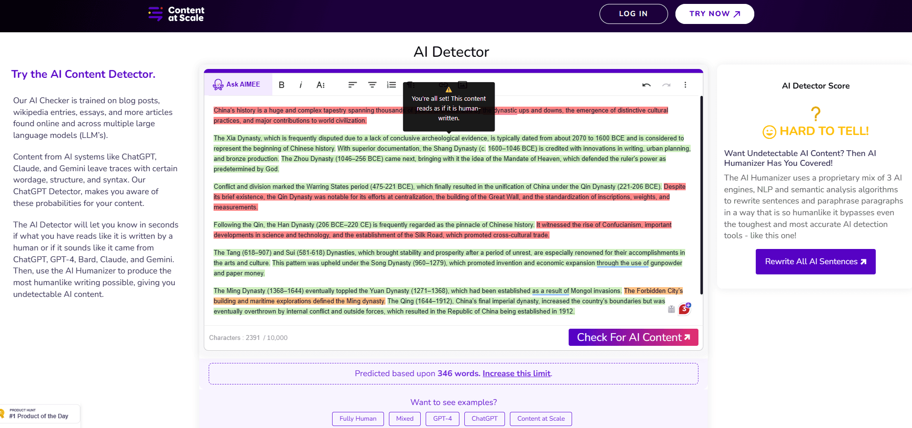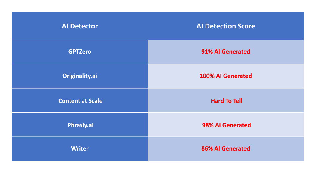 As you can see from the table above, the results are pretty easy to analyze. Quillbot totally failed 4 out of 5 of the tests. The best result it could achieve was a sentence mentioned from Content at Scale, which is "Hard to tell". It somehow shows that the AI Detector of Content at Scale wasn't as good enough as it claims on its website.