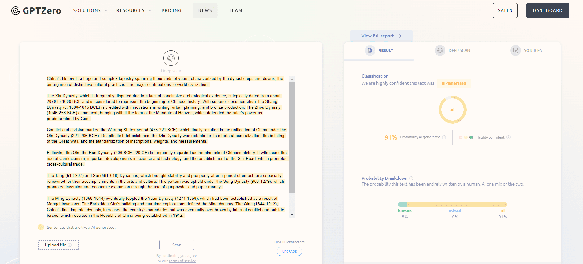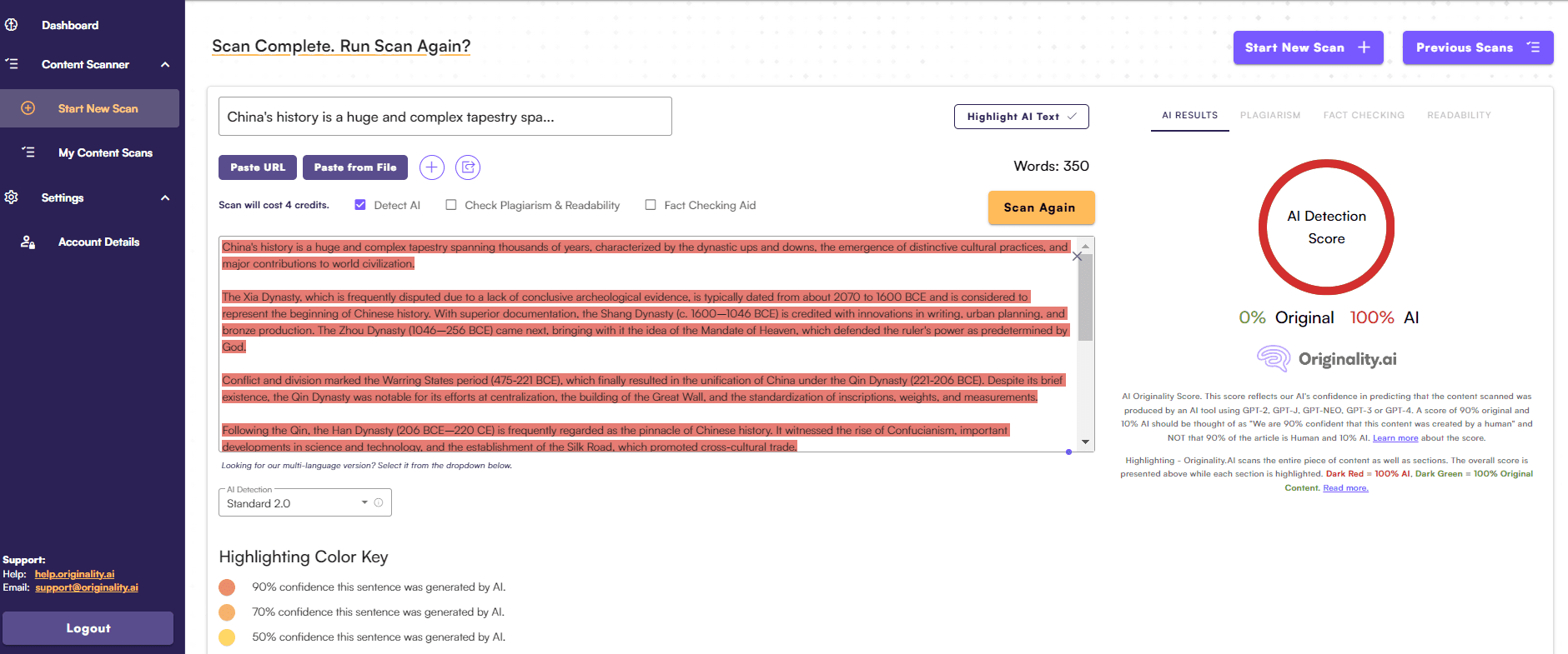 We continue to copy and paste the same essay into Originality.ai’s content scanner. Below, you'll find screenshots of the scan result.