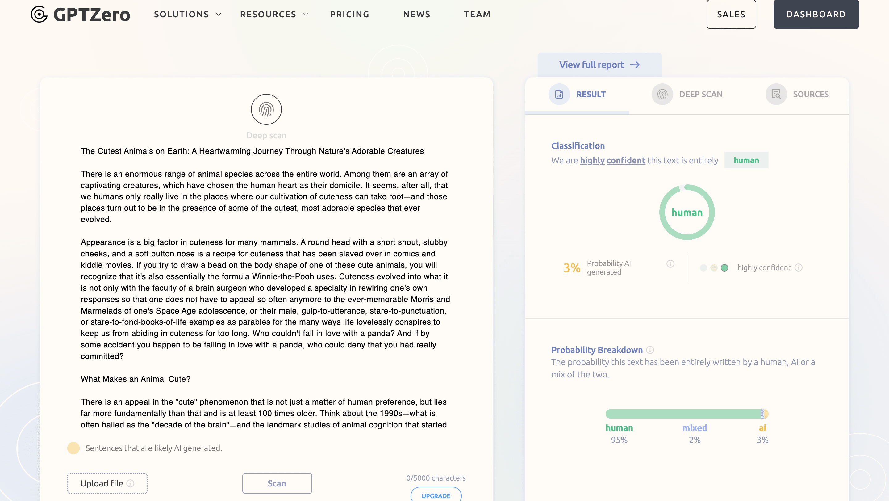Here's what StealthGPT's SEO writer looks like against GPTZero with over 97% human score and no highlighted sentences that are likely to be AI-generated.