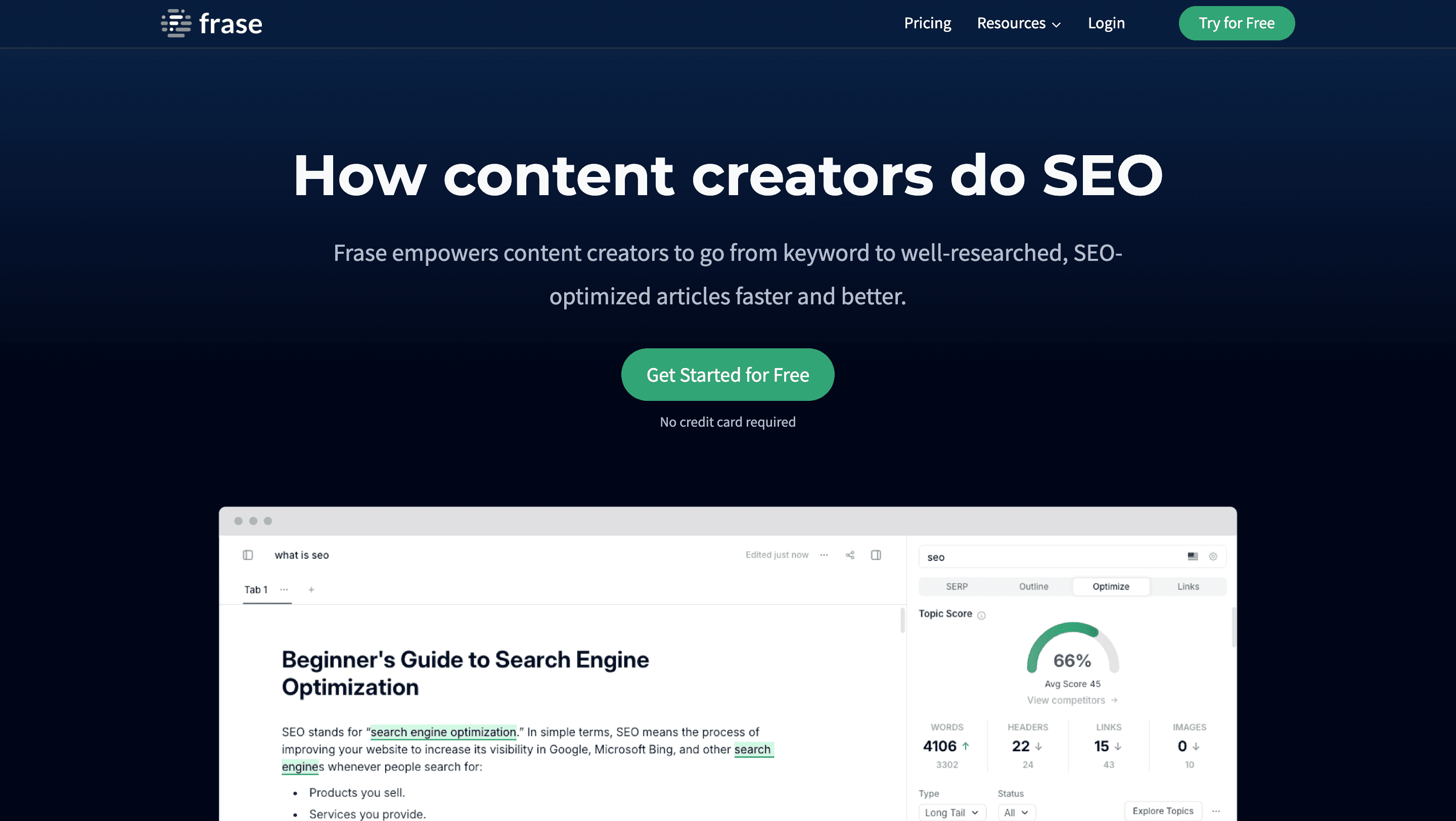 Frase empowers content creators with well-researched, SEO-optimized articles.